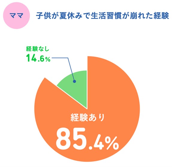 調査では、⼩学⽣を持つママの8割以上が「夏休みで子どもの⽣活習慣が乱れた経験がある」と回答。