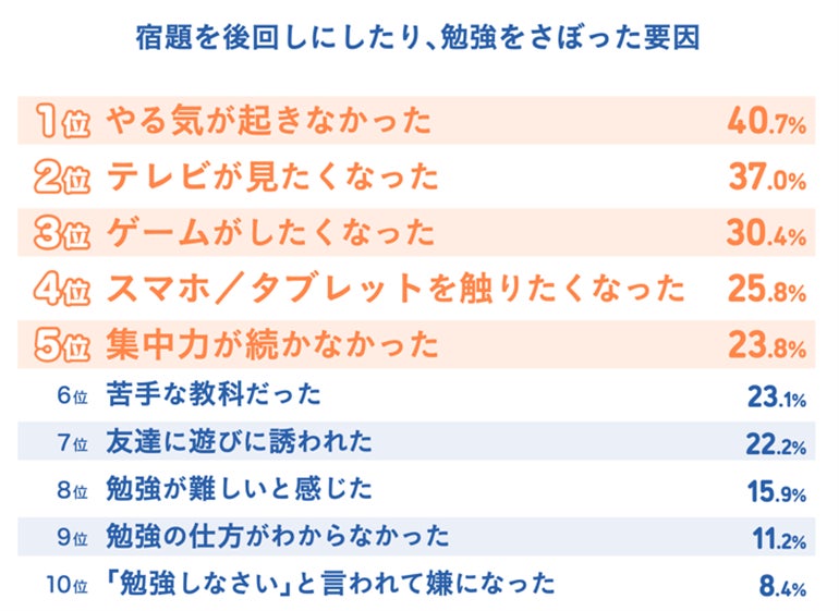 そもそも子どもはサボって当たり前です。なぜなら未成熟な年頃の上、家庭には「テレビ・ゲーム・漫画」など、多くの誘惑が存在するからです。今回のアンケートでも、小学生の9割は「宿題を後回しにしたりサボったりした経験がある」と答えています。