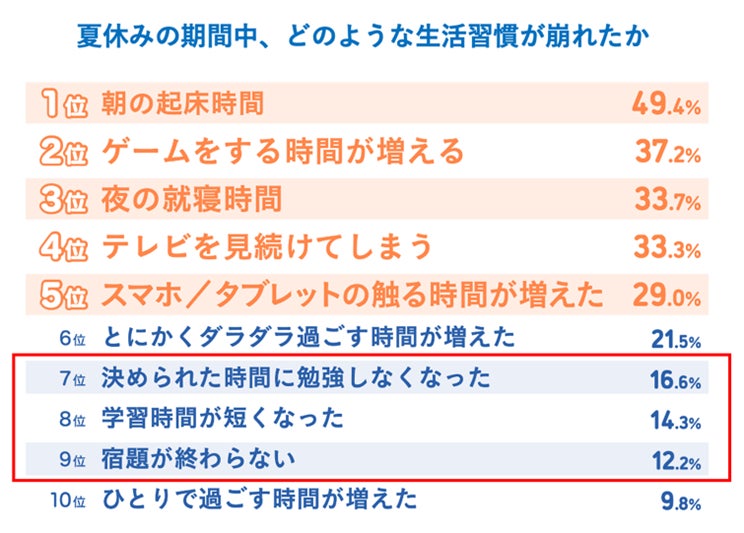 特に「起床時間」が半数を占め、「就寝時間」も3割程と、夏休みは1⽇の⽣活時間そのものが変化しています。その結果、「決められた時間に勉強しなくなった」「学習時間が短くなった」「宿題が終わらない」と学習習慣にも影響することも。