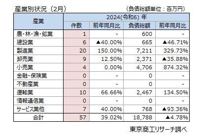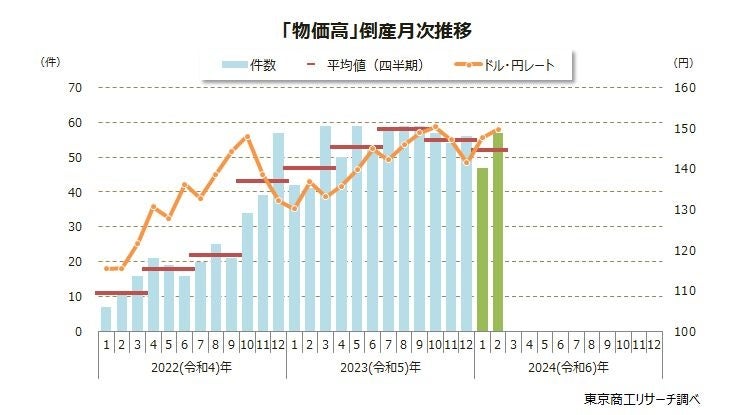 2024年2月の「物価高」を起因とした倒産は57件(前年同月比39.0%増)で、前年同月の41件の約1.4倍に増加した。今年に入り、2カ月連続で前年同月を上回った。