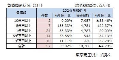 負債額別は、負債1億円以上が33件(同43.4%増)で、約6割(構成比57.8%)を占めた。