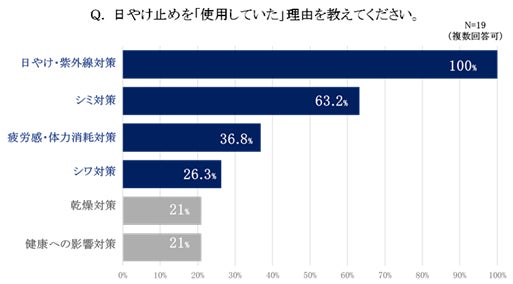 もともと日やけ止めを使用していた人へ「使用していた理由」を尋ねたところ、全体の63.2%の方が「シミ対策」を挙げ、半数以上の方が「美容目的」で使用していることが伺えます。「疲労感・体力消耗対策」「健康への影響対策」と答えた人は少数派にとどまりました。