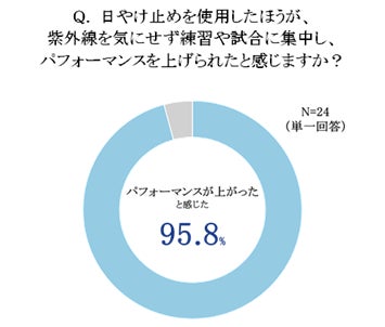「日やけ止めを使用したほうが、紫外線を気にせずに練習や試合に集中し、パフォーマンスを上げられたと感じますか?」という質問に対し、95.8%が「パフォーマンスが上がった気がする」と回答。