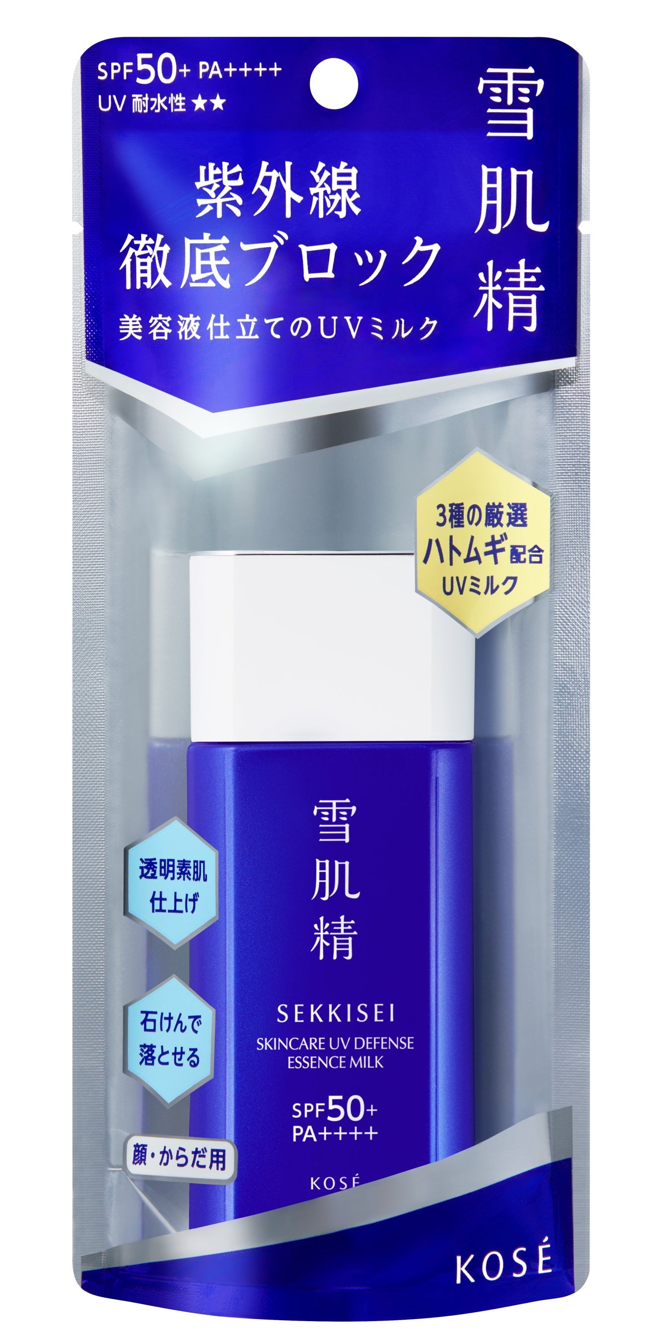 ② | 雪肌精 スキンケア UVエッセンス ミルク | SPF50+ PA++++ UV耐水性★★ | しなやかにフィットして快適にまもる 表面さらり雪溶けタッチU Vミルク ・動きにフィットするストレッチヴェール ・3種のハトムギ配合(国産ハトムギエキス・ハトムギ発酵エキス・ハトムギ水) ・こすれに強い ・海の環境に配慮した処方 ・大気中の微粒子(花粉・PM2.5・ちり・ほこり)をブロック ・化粧下地効果 ・洗顔料・ボディーソープで落とせる | 60g | 2,400円 (税抜) 2,640円 (税込) |
