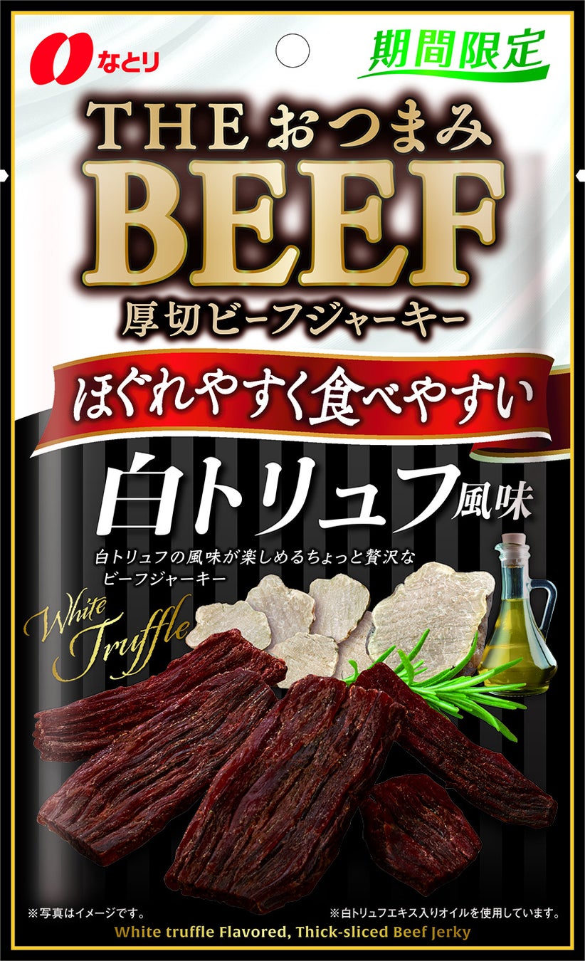 株式会社なとり(本社:東京都北区、会長兼社長:名取三郎)は、「THEおつまみBEEF 厚切ビーフジャーキー 白トリュフ風味」を10月15日(火)より期間限定で新たに発売いたします。