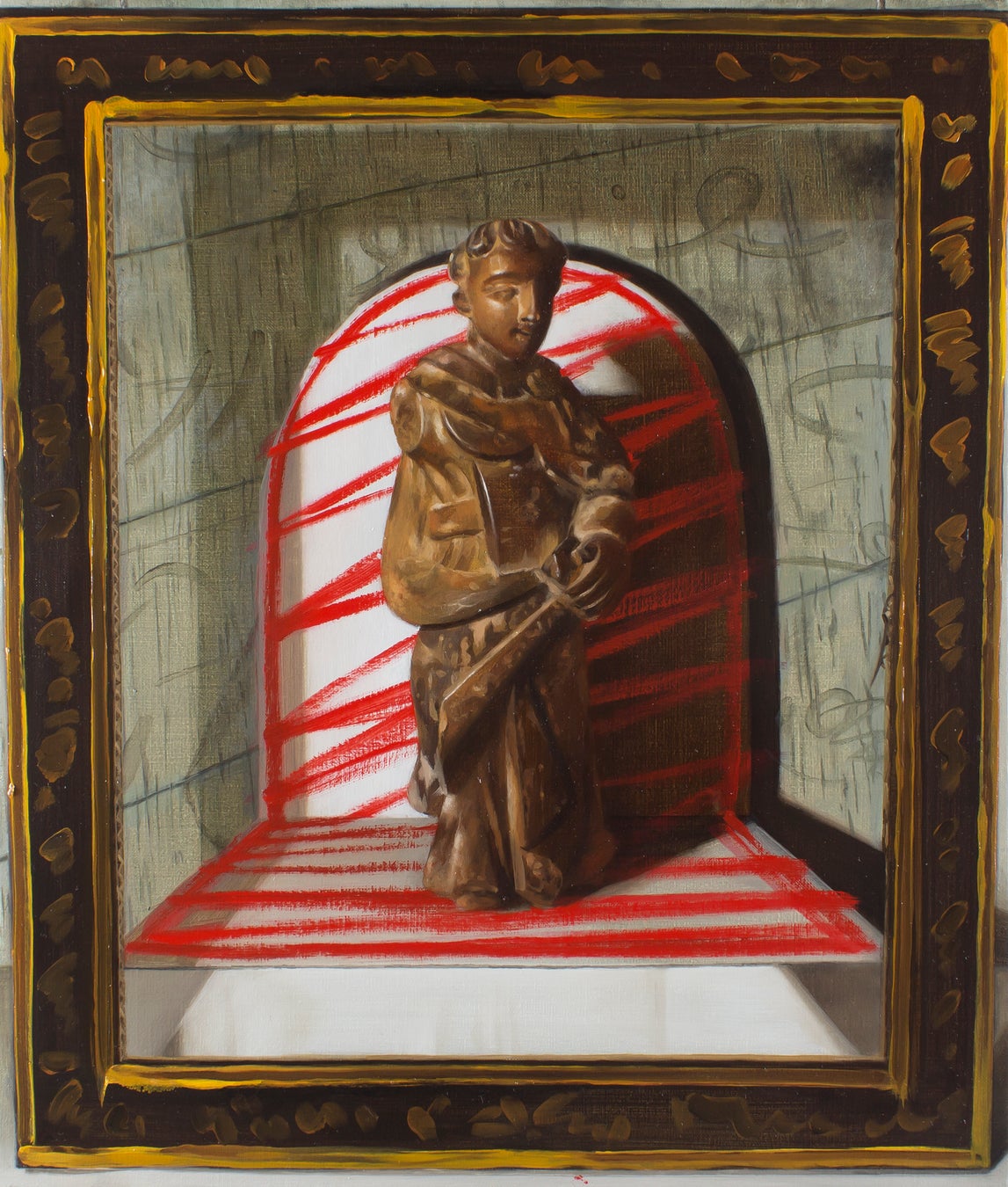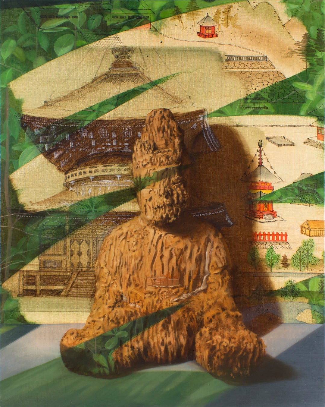 熊倉涼子は、神話・伝承、学問・思想など、人類の探求において生み出されたイメージと現実世界の様々な物を掛け合わせた油彩画を制作しています。描かれるモチーフは、作家自ら造作したオブジェもあります(参考作品参照)。作品は、こうしたオブジェに加えて、神話や歴史上の登場人物を思わせる人物像や記号など、多様なモチーフのレイヤーを複雑に重ねて構成されています。見どころは、圧倒的な写実表現により、過去のイメージと現実に存在する物が、画面上でフラットに同義化されていることです。本来なら異なるもの同士が同義化されることで、現実の前提を覆すパラドックス的な感覚を覚えさせ、いま目に映るものは果たして真実として映っているのか、を観る者に問いかけます。