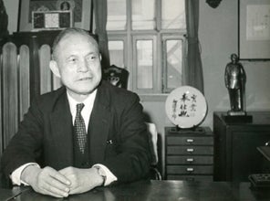 1960年代の加藤清二郎。後ろに直筆の「実業は奉仕也」の皿が見える