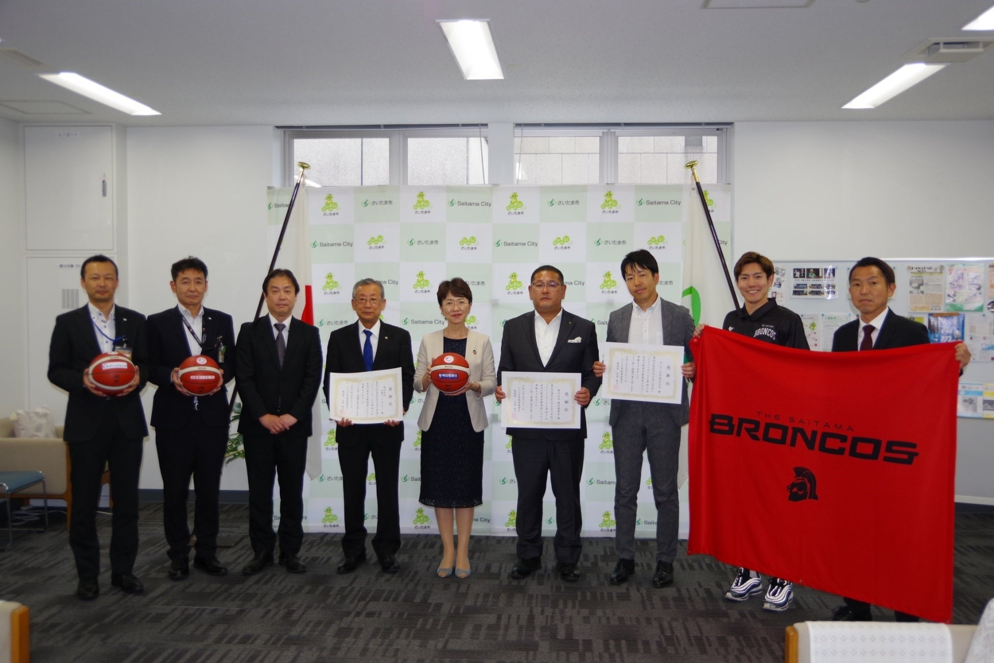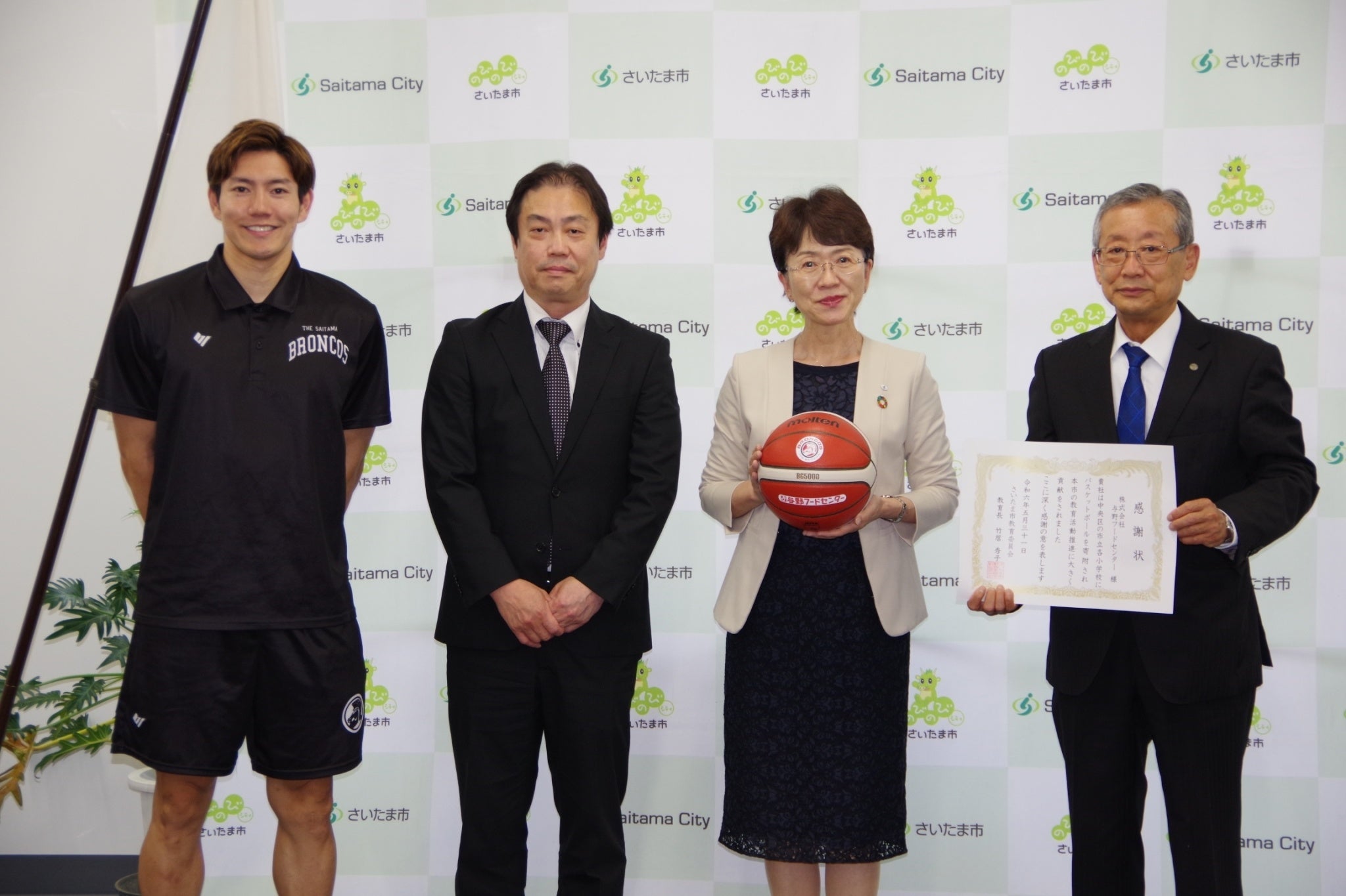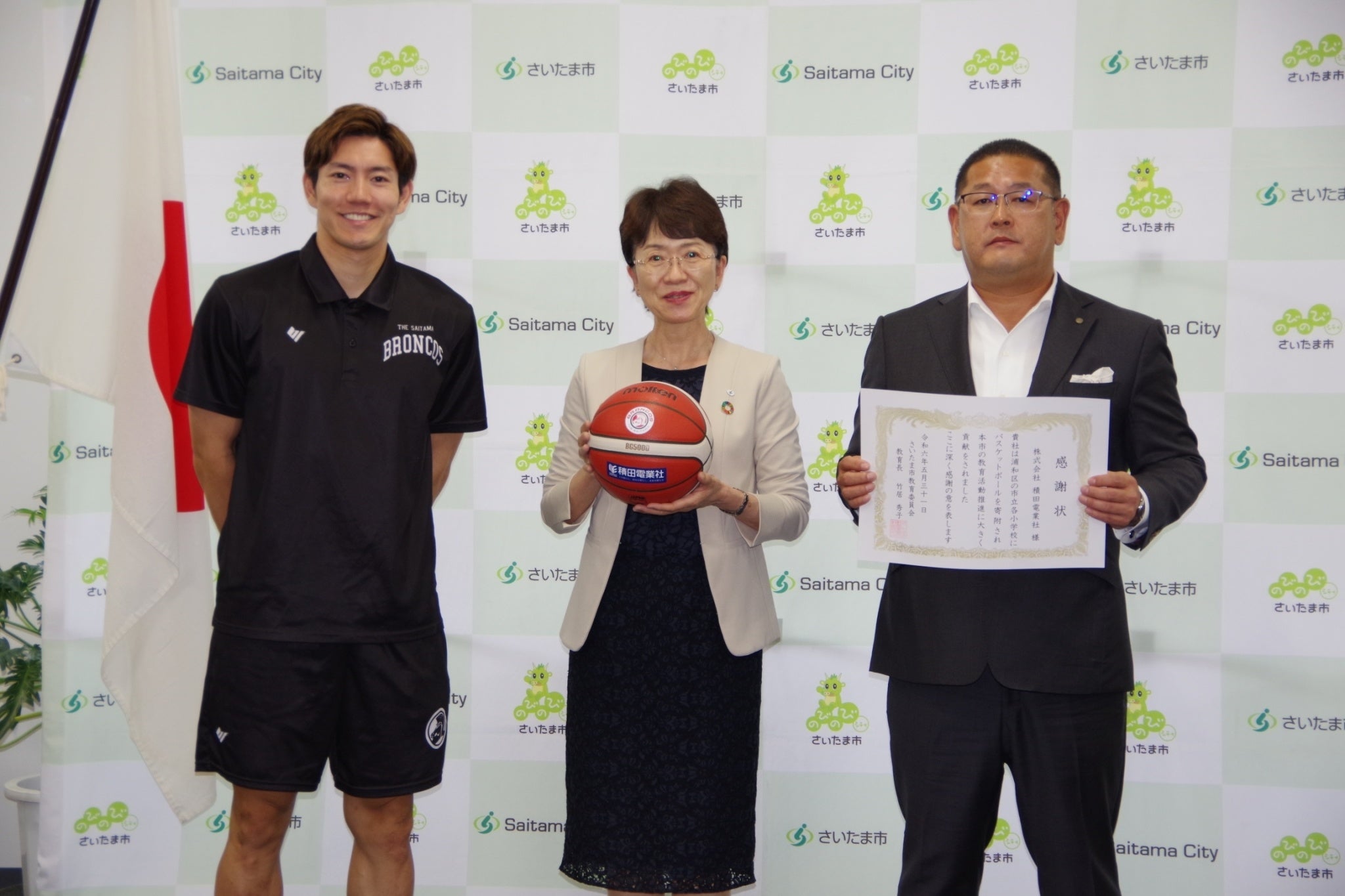 「ホームタウンさいたま市の子どもたちに、株式会社積田電業社、株式会社与野フードセンター、サイデン化学株式会社の皆様とともにバスケットボールを届けられることを大変嬉しく思う。さいたま市内ではさいたま市小学校体育連盟主催親善バスケ大会が全105校の小学校6年生(約1万人以上)が行われ、さいたまブロンコスも特別協力している。このブロンコスロゴのバスケットボールで地元の子どもたちに1人でも多くバスケットボールの楽しさを知ってもらいたい。