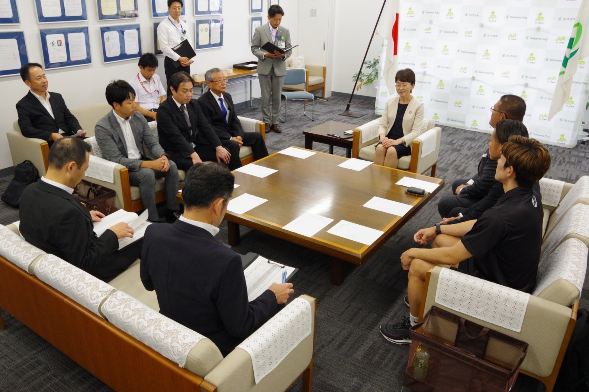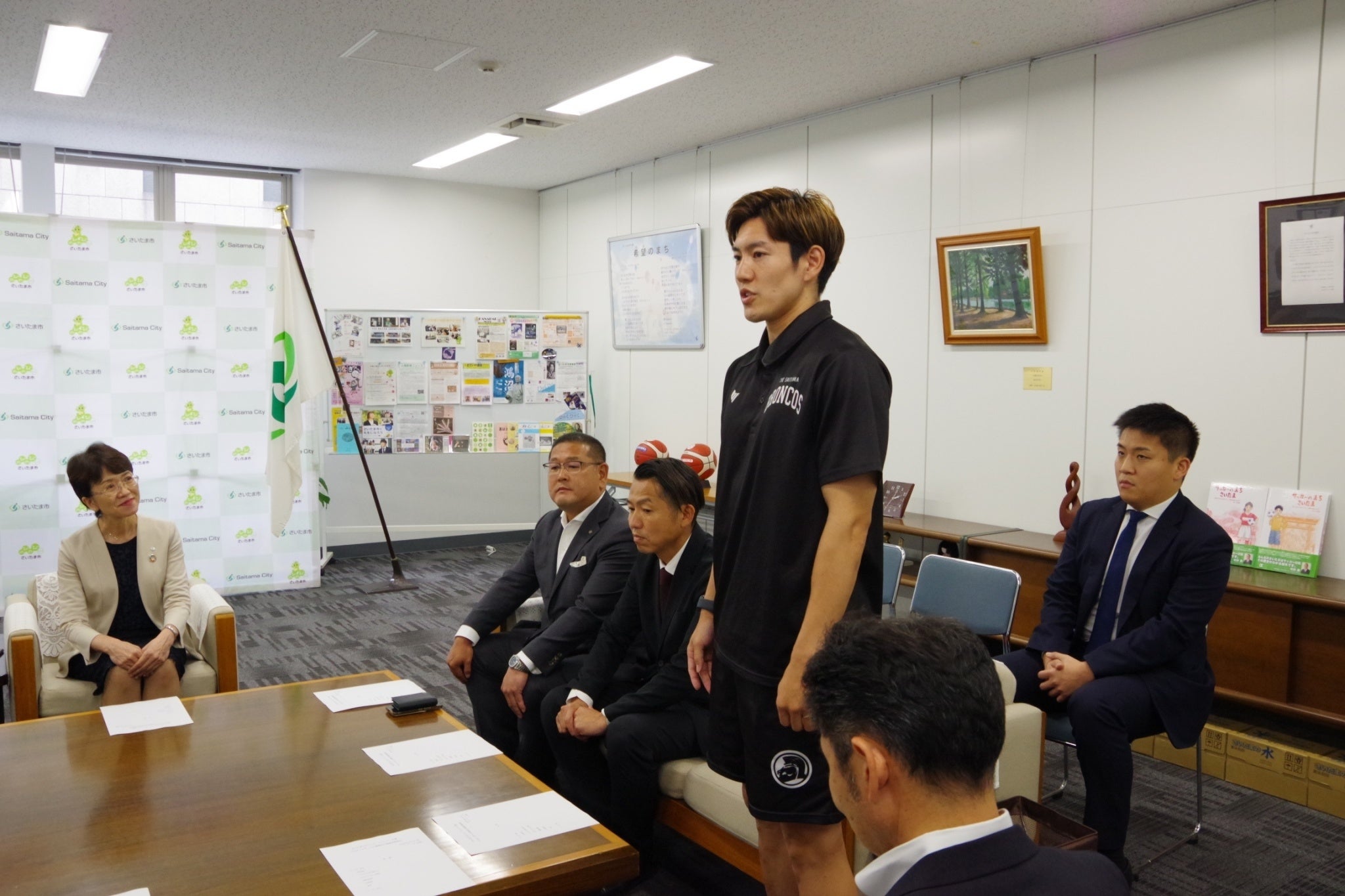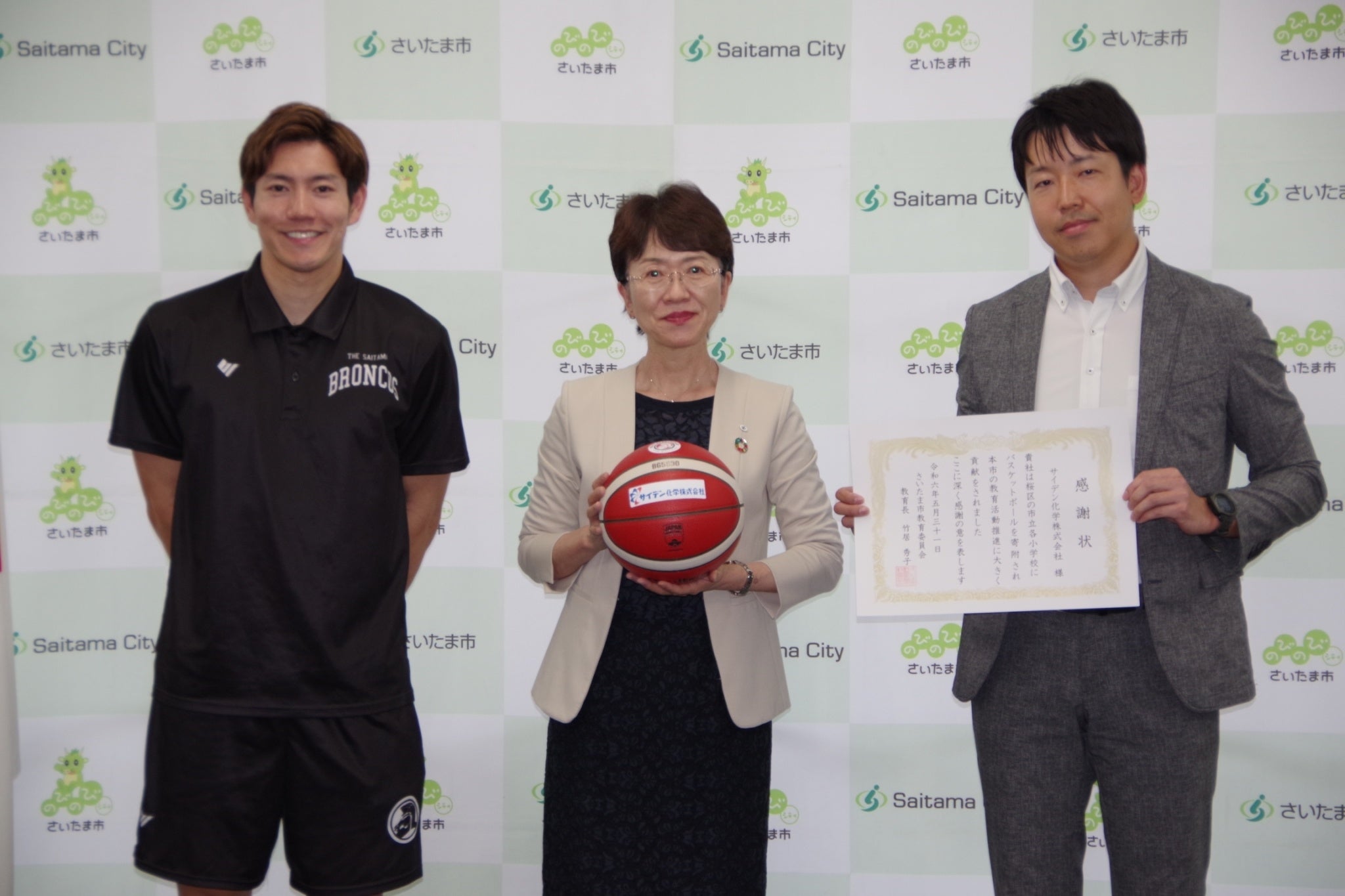「弊社は主力工場がさいたま市桜区にあり、これまでに浦和レッズやパラスポーツの応援を行ってきた。また桜区のサイデン化学アリーナ(さいたま市記念総合体育館)のネーミングライツ契約等様々なスポーツの支援を行っている。このたび、バスケットボールとのご縁をいただき、桜区の子どもたちを支援できることを嬉しく思っている。弊社が扱う商品(接着剤、粘着剤)はスマートフォンやテレビ等でも使用され、桜区の工場から世界に広がっている。今回寄贈したバスケットボールで地元の子どもたちにスポーツを楽しんでいただき、そして将来は世界に羽ばたいてもらいたい。」