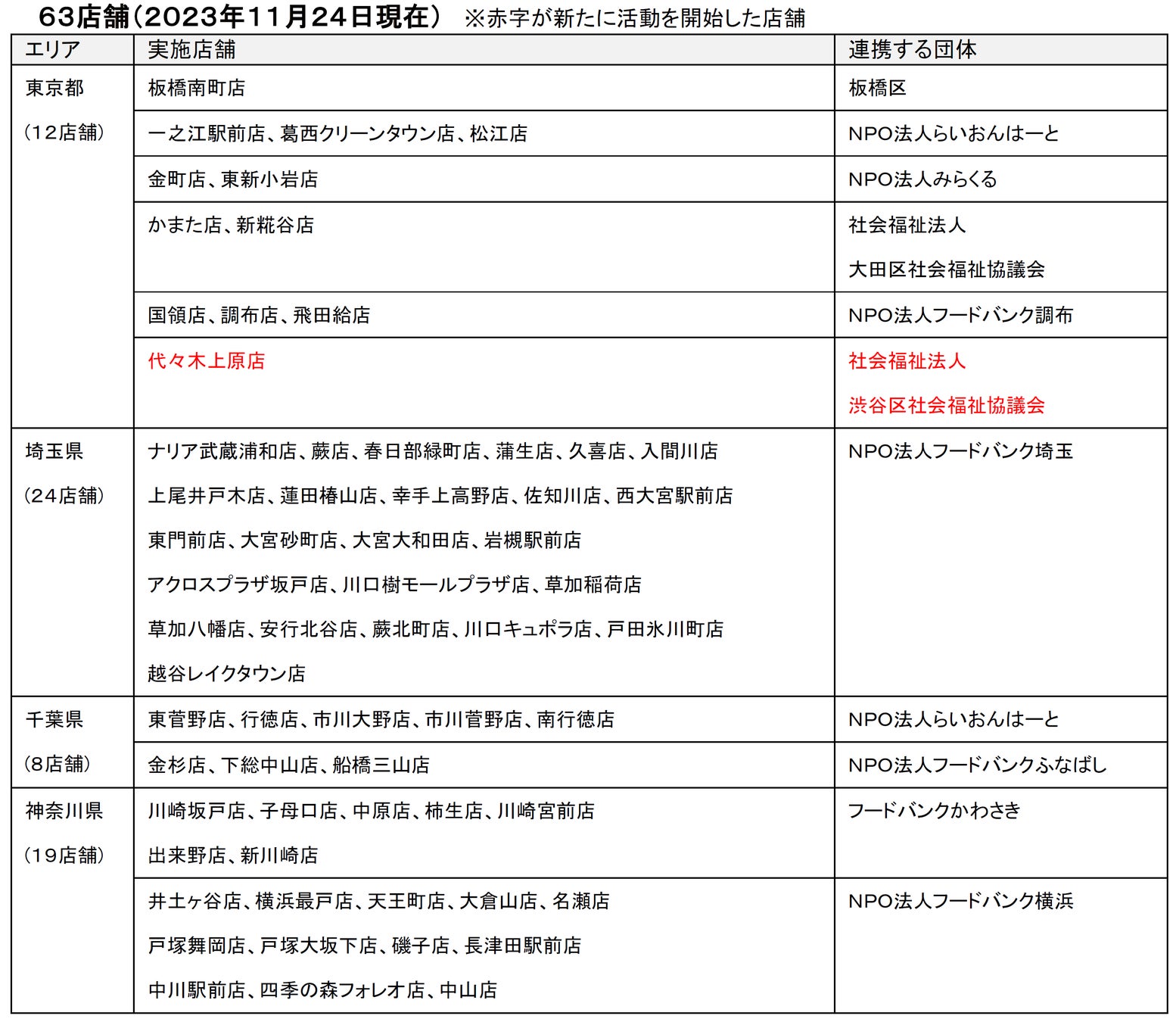 活動拡大により、11月24日現在の活動店舗は東京都12店舗、埼玉県24店舗、千葉県8店舗、神奈川県19店舗の計63店舗(10団体との連携)となりました。