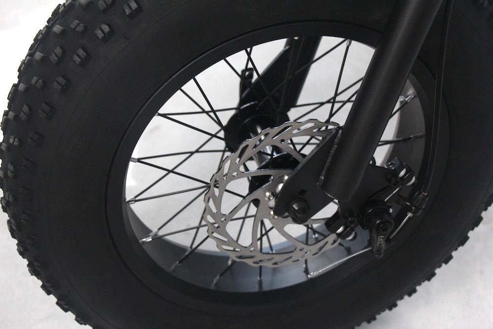 ファットタイヤは、16インチ4.0サイズの幅広タイヤで走りも安定します。 制動性の高いディスクブレーキでパワフルな走行でもしっかり停車します。機械式ディ スクブレーキで、メンテナンスも簡単です。