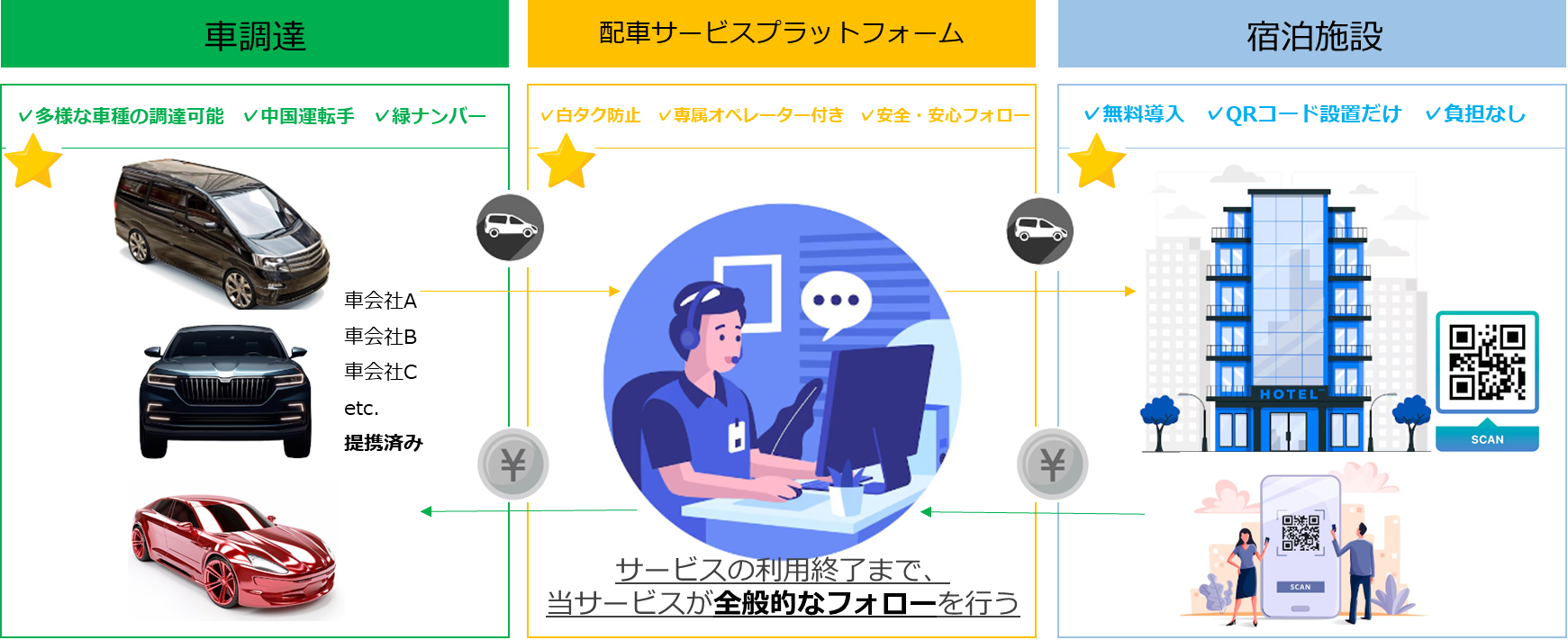 外国⼈観光客にとって、異国の⽇本でハイヤーを⼿配し、⽬的地や⽀払⽅法を正確に伝えることは簡単ではありません。また、知らずに悪質な“白タク”の利用に至る経緯が大きな社会問題となっています。「セルフ配車サービス」は、中華圏観光客のほとんどが日常的に利用しているWeChatの利便性である、QRコードをスキャンし、画像の案内に沿った情報の入力のみでハイヤーの予約、決済までが可能です。また、条件が合えば中国語を話せるドライバーのリクエストや、お問い合わせの際はWeChatにてオペレーターが中国語で案内することで、お客様に安心してご利用いただけるサービスとなっています。インバウンドの主力である中華圏観光客にとっては、まさにフレンドリーな操作環境と、安心で便利な決済を兼ね備えたサービスといえます。