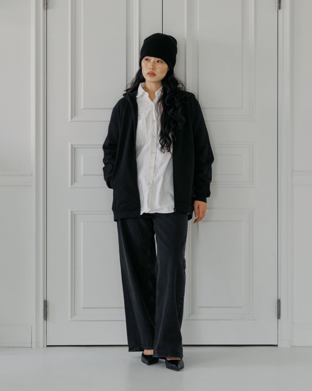 子どもを抱っこしたまま着ることができるスウェットフルジップパーカー。