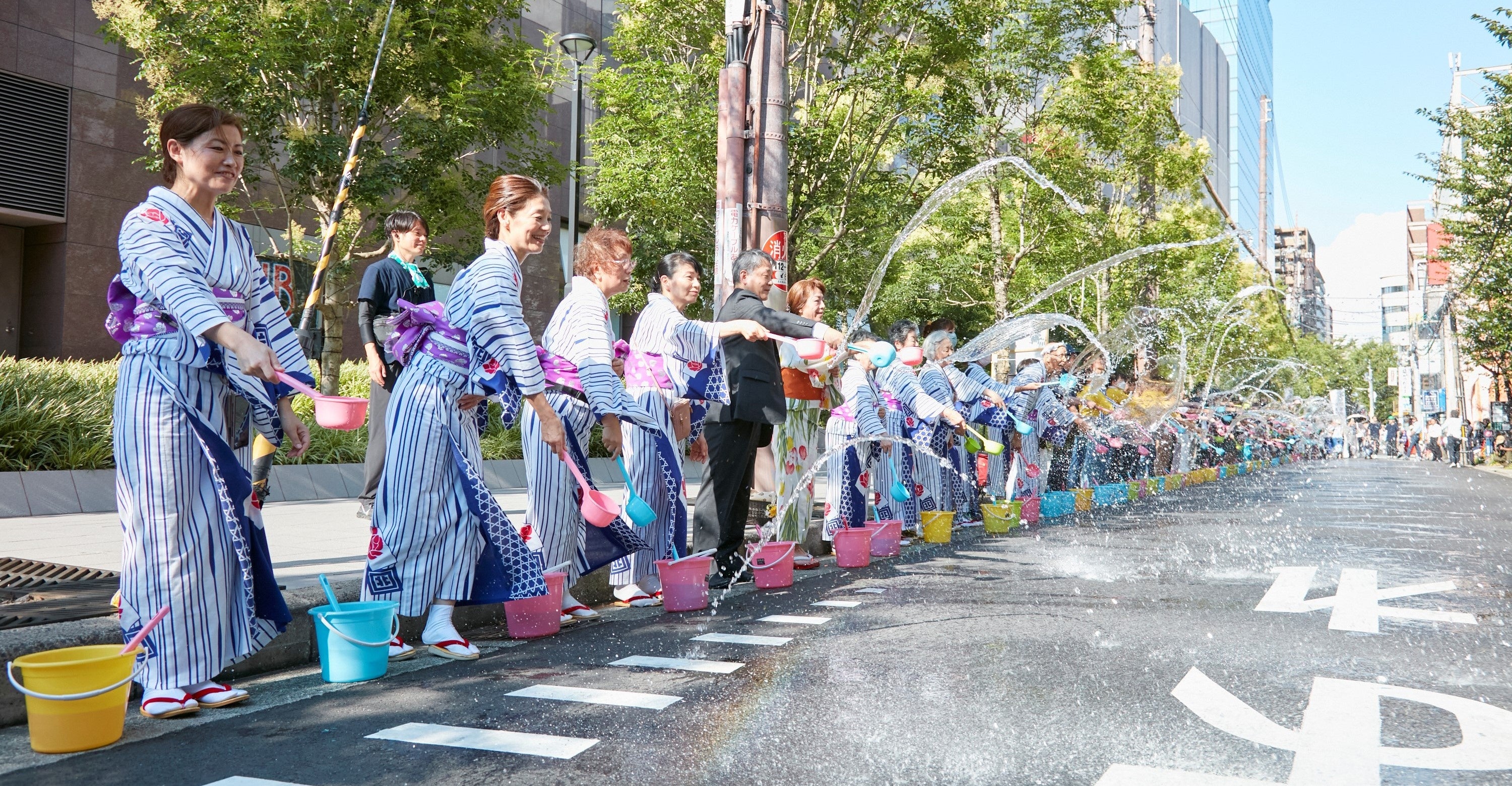 「梅田涼しくな~れ!」の掛け声で、3か所の会場で一斉に打ち水を実施します。梅田打ち水大作戦に参加して梅田の街を涼しくしましょう。
