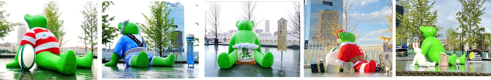 フランスを代表する現代アーティスト、ファブリス・イベールの作品にはいくつかのキャラクターが登場します。「テッド・イベール」もその中の一つで、特に熊(テディ・ベアー)はファブリスが好んで使うモチーフです。緑色は自然と人間の関係について提案し続けるファブリスの姿勢をあらわしており、彼の分身のような存在です。ここを通る方々に、水辺の楽しさを感じていただく役割を担っています。梅田のフレンドリーなシンボルとして、末永くかわいがってください。