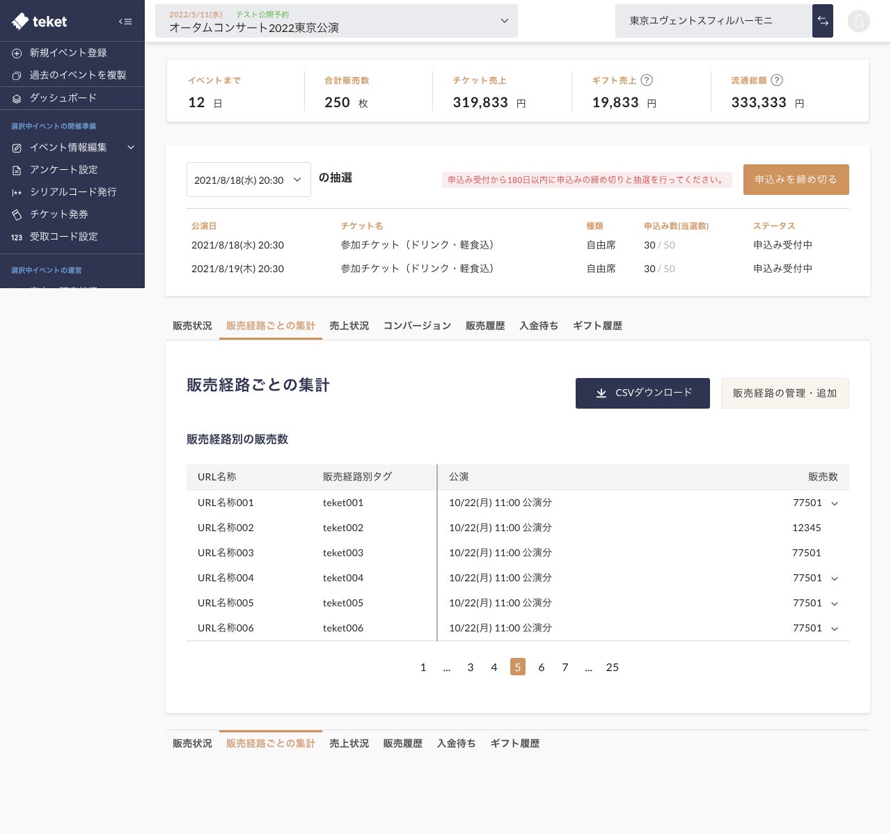teketは、各経路別に正確な販売データを把握することで、主催者がより効率的に販売状況を管理し、個別のパフォーマンスを可視化できる環境を提供します。