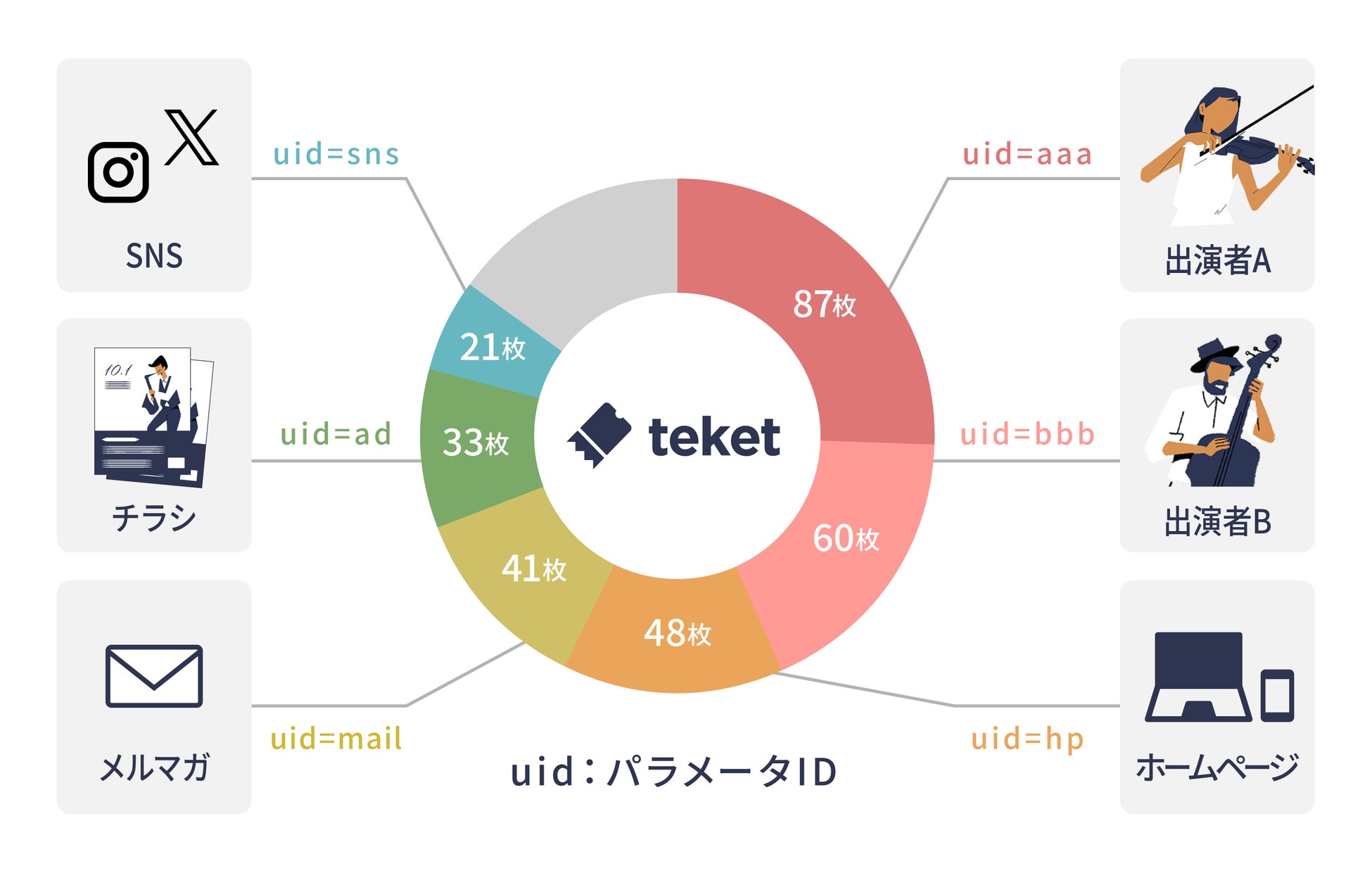 URLにユーザIDをパラメータとして付与することで、どの販売経路からの集客かを詳細に把握でき、主催者のチケットノルマ管理をサポートします。
