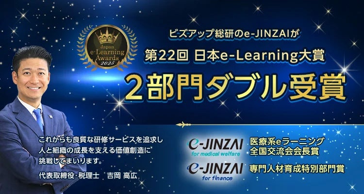 株式会社ビズアップ総研(本社:東京都港区、代表取締役:吉岡高広)の提供するWEB研修システム「e-JINZAI for medical welfare」と「e-JINZAI for finance」が、第22回日本e-Learning大賞において、「医療系eラーニング全国交流会会長賞」と「専門人材育成特別部門賞」の2部門でダブル受賞するという快挙を達成したことをお知らせいたします。