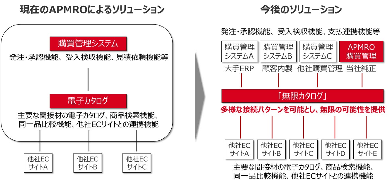 この機能は従来、APMROをご利用いただくことが前提でした。しかしながら、当社のお客様、特に製造業のお客様は、購買システムに大手のERPや自社システムを使い、APMROから電子カタログ機能のみを抜き出し、システム連携でご利用になるケースが多いのが実態です。そこで今般、必要な商品をダイナミックにカタログ化することで文字通り無限に品目数を増やせることを目指した電子カタログ機能を「無限カタログ」と名付けて、提供していくこととしたものです。