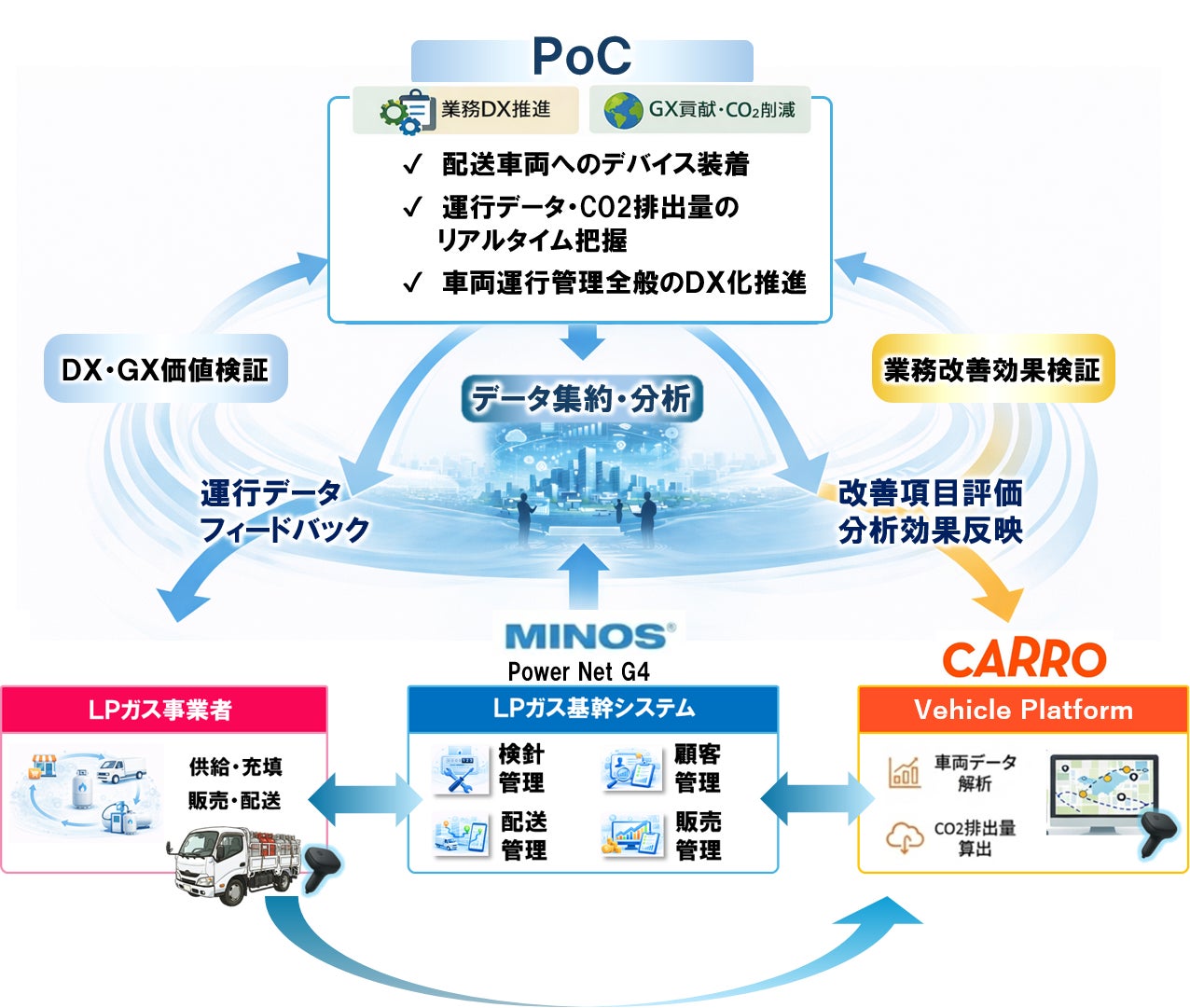 ミノスは、LPガス業界向け基幹システム「Power Net G4」を通じて、検針・配送・請求などの業務DX(デジタルトランスフォーメーション)を長年にわたり支援してきました。一方、CARRO JAPANは、AI(人工知能)および車両データ解析技術を強みとし、車両の稼働状況の可視化、最適配備、CO₂排出量削減を実現する車両管理ソリューションを提供しています。