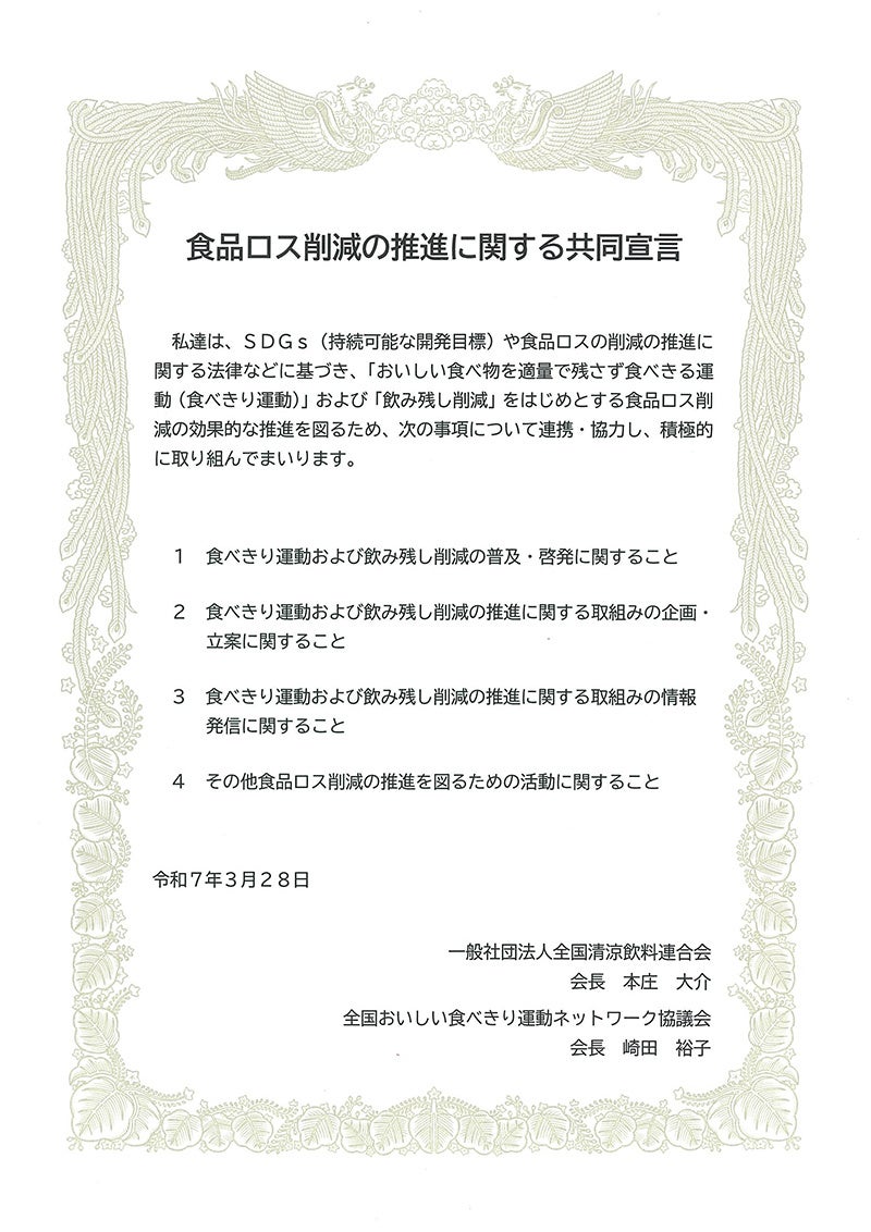 一般社団法人全国清涼飲料連合会(会長:本庄大介、以下略称:全清飲)は全国おいしい食べきり運動ネットワーク協議会(会長:崎田裕子)と3月28日、共同宣言を行いました。
