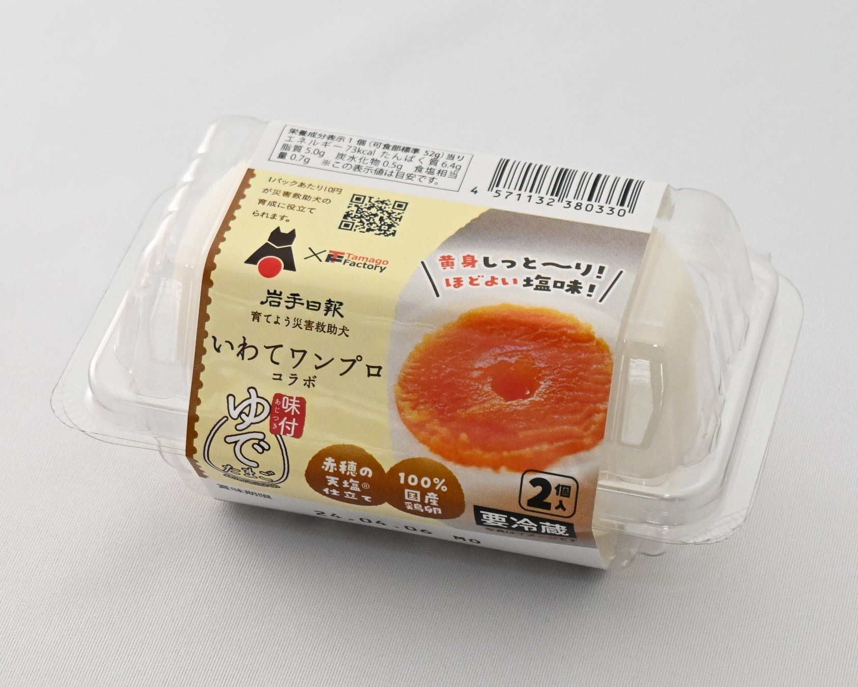 このたび「いわてワンプロ」とたまごファクトリーの想いが一つとなり、コラボ商品「いわてワンプロ コラボ 味付ゆでたまご」(1パック2個入り)を発売いたします。たまごファクトリーは売り上げ1パックにつき10円を災害救助犬育成・普及の活動費として寄付いたします。味付ゆでたまごをご愛顧いただいている皆さまにも災害救助犬の捜索活動に対し理解が広がっていくことを期待しています。