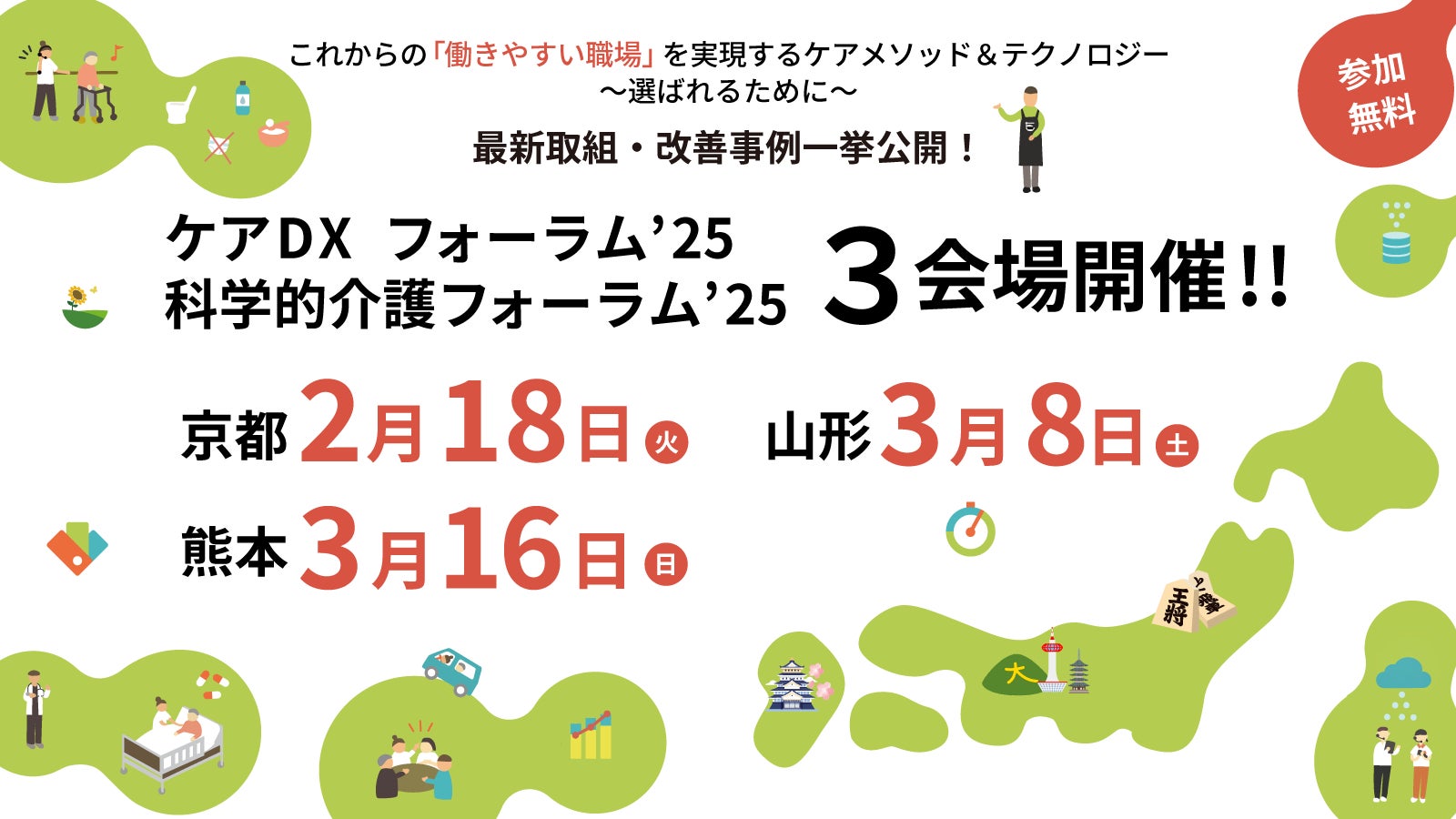 2025年2月18日(火)京都、3月8日(土)山形、3月16日(日)熊本の3会場で、介護・障害福祉の未来を切り拓く画期的なイベント「ケアDXフォーラム’25」および「科学的介護フォーラム'25」を開催いたします。