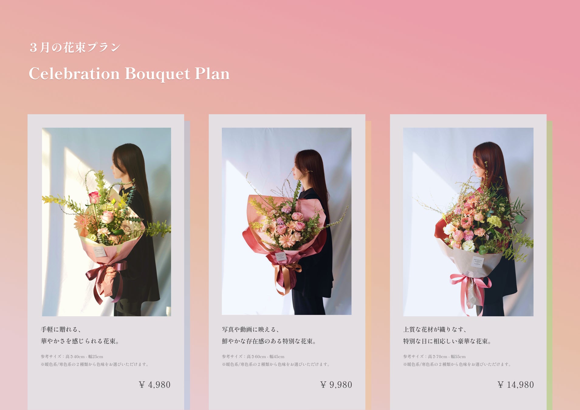 TABULAでは、卒業式をはじめ、誕生日や記念日、送別会などの特別なシーンを彩る3月限定の花束プランをご用意しました。また、注文時に花束のお色味をお選びいただけます。(例:暖色系の花束:ピンクやオレンジ系の華やかな花束・寒色系の花束:スタイリッシュなパープルや葉ものを使用した花束)今年は以下の3つのプランからお選びいただけます。