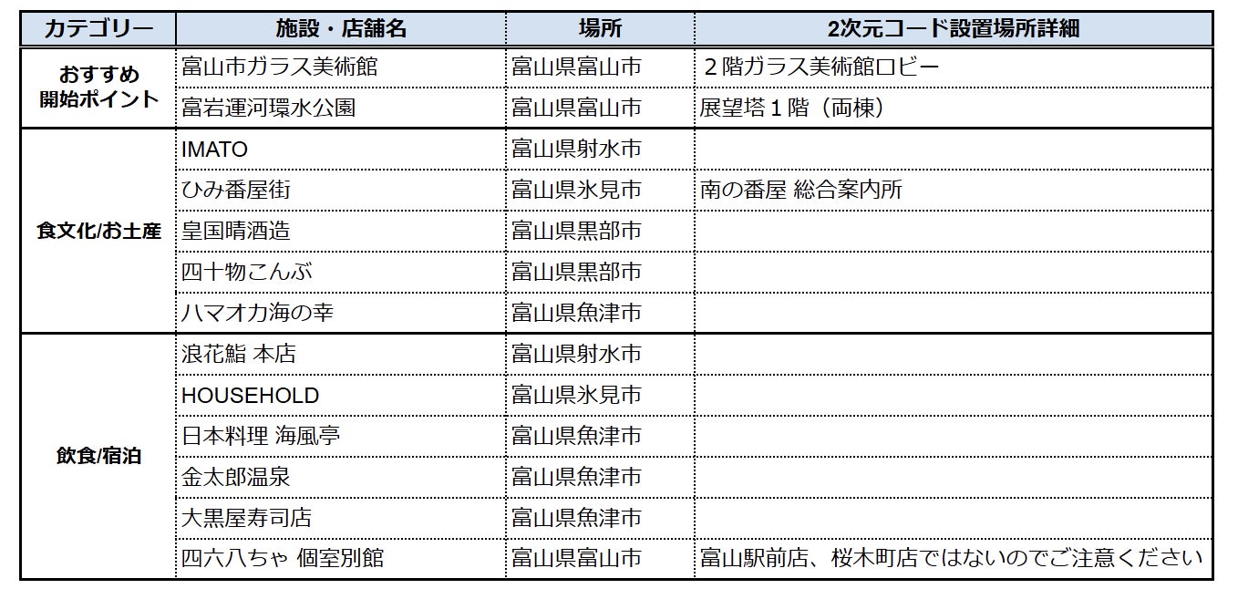 「2025年に行くべき52か所」としてニューヨークタイムズ紙に取り上げられた「富山市ガラス美術館」や富山県観光サイト「寿司の美味しさを紐解く富山旅」で紹介している寿司店などの飲食店 や酒蔵、お土産物店などの観光スポット等を巡り、2次元コードを読み取るだけで、スマートフォン上でデジタルキャラクターを獲得できます。当スタンプラリーを通じて、富山の魅力を発信し、地域の新たな観光体験を創出することを目指します。