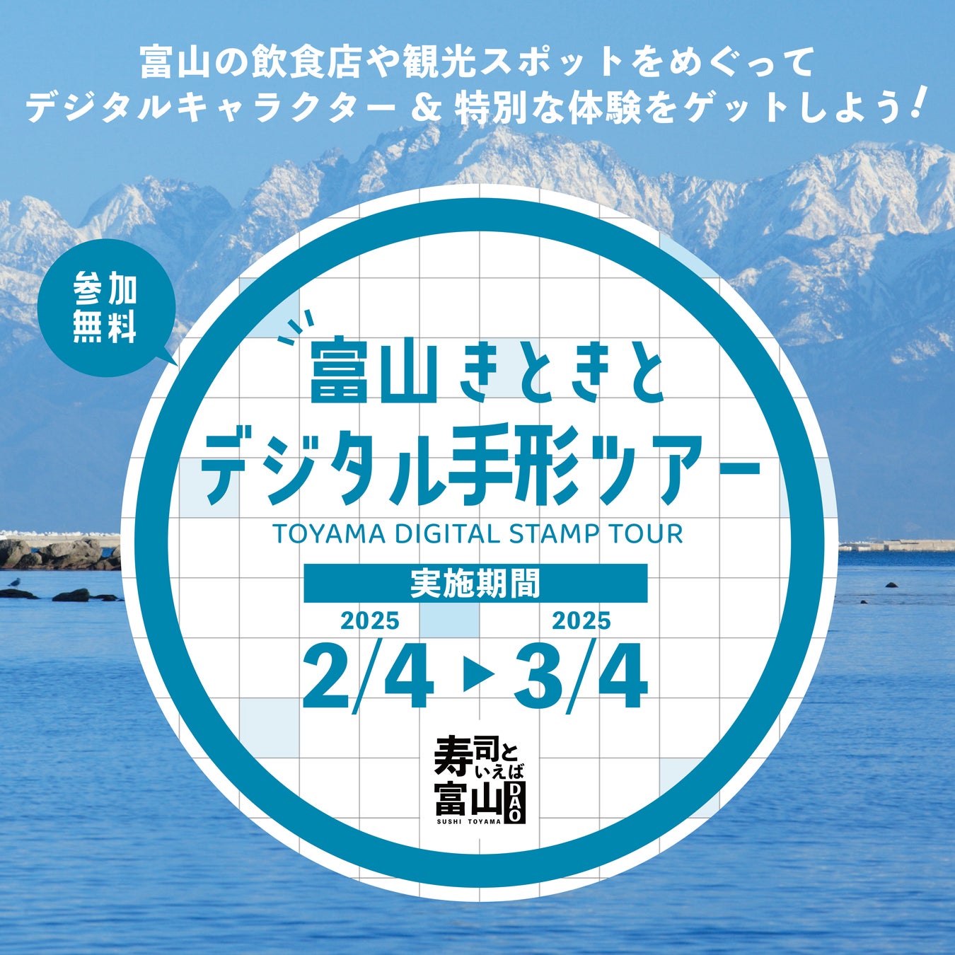 富山県と寿司といえば富山DAO(運営 Web3 Times合同会社: 東京都中野区、代表社員:末次祥太郎)は、2025年2月4日(火)から3月4日(火)まで、デジタル技術を活用した観光デジタルスタンプラリー「富山きときとデジタル手形ツアー」を実施します。