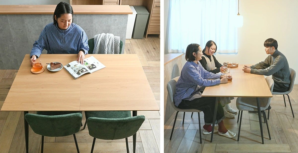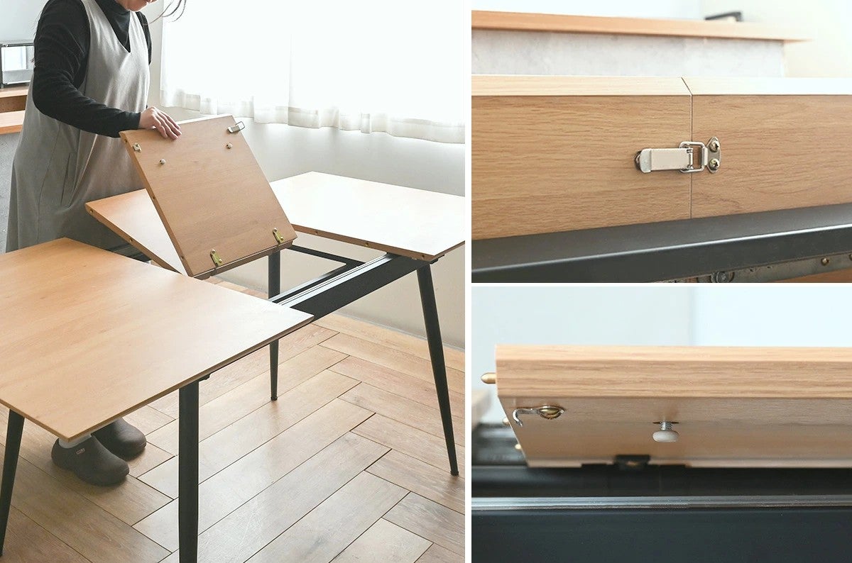 テーブルは120cm幅、160cm幅の2段階で使用可能な伸長式。両サイドを開き、中央板を取り出すだけの簡単サイズ調整