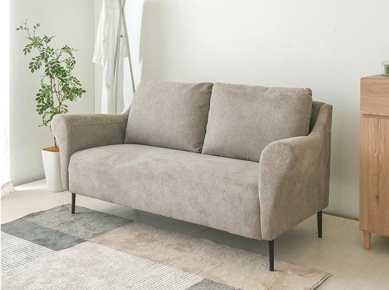 丸みのあるフォルムとスリムなスチール脚がおしゃれな、モダンで洗練されたデザインの二人掛けリビングソファです。