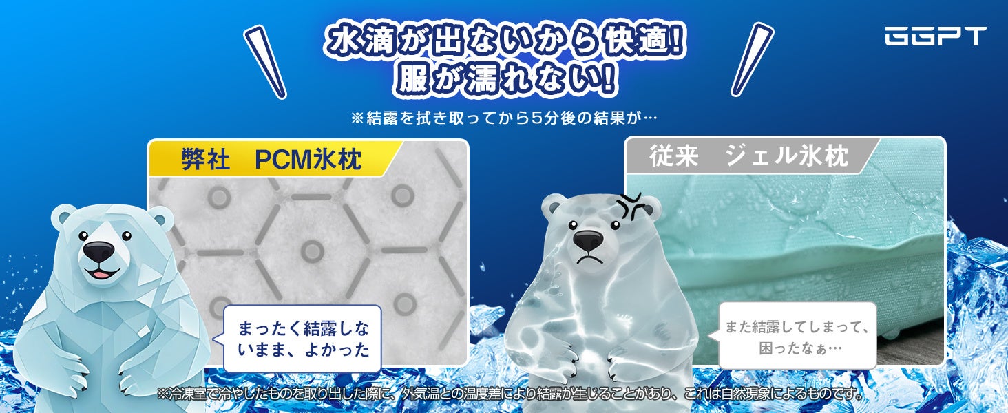 従来の氷嚢や冷却ジェルアイス枕とは異なり、GGPTの製品は革新的なPCM(相変化材料)を使用しています。結露の心配がなく、寝具や衣類を濡らすことがありません。自然凍結の場合は60〜120分の冷たさが持続しますが、冷蔵庫で冷やすとさらに長時間冷たさを楽しむことができます。また、1,000,000回以上繰り返し使えるため、経済的でもあります。