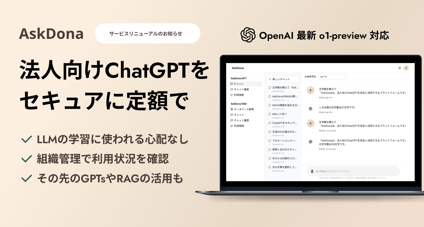 AskDona、法人向けChatGPT等活用プラットフォームへ大幅リニューアル!OpenAI社の最新モデル o1-previewにも対応
