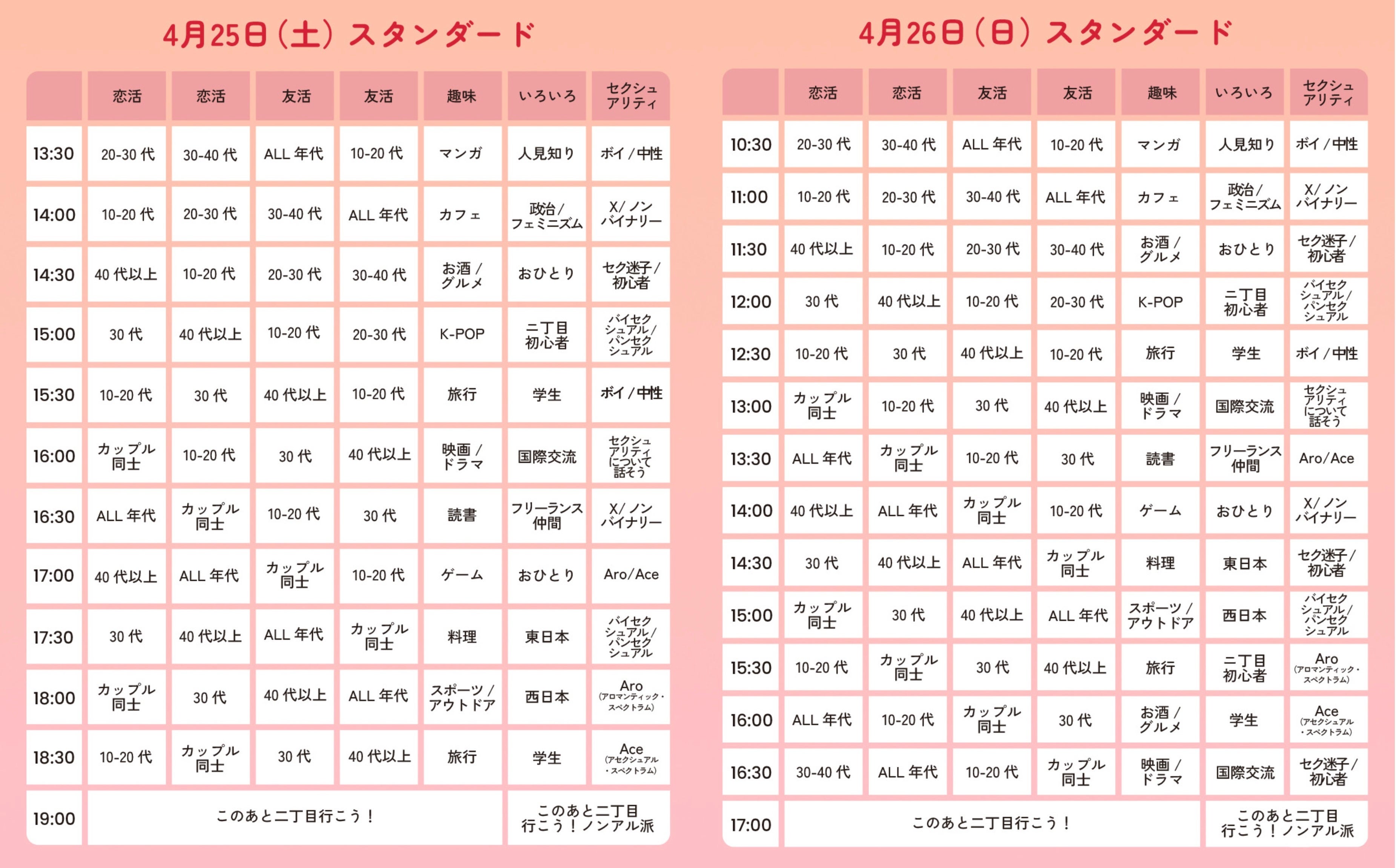 スタンダードエリアは1日目7部屋×12枠、2日目7部屋×14枠、プラチナエリアは1日目4部屋×12枠、2日目4部屋×14枠でオフ会が同時進行で開催されます。オフ会内容は、人気の「恋活」「友活」「趣味」「セクシュアリティ」のカテゴリーを細分化したテーマで実施予定で、好きなテーマの部屋に自由に出入りしていただけます。