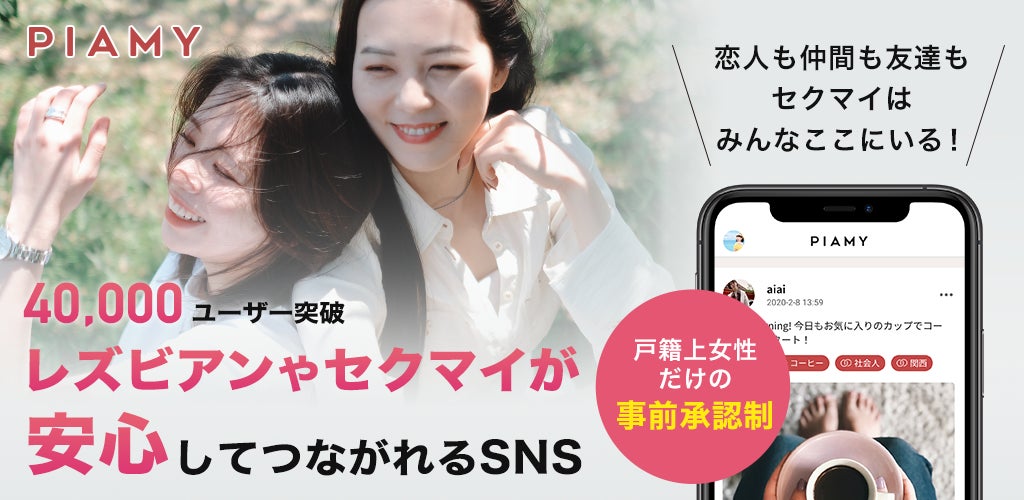 「PIAMY」は、レズビアン、セクシュアルマイノリティの方が安心してつながれる居場所を提供するSNSアプリです。文字や写真を投稿して、共通点でゆるやかに仲を深めることができるため、「その人らしさを知って共感でつながる」ことができます。マイノリティのオンライン空間での安全性を重視することで、ユーザーはサイバーハラスメントやアウティングのリスクを気にせず、のびのびと自己表現ができる仕様になっています。2021年のリリース以来、現在では4万人以上のユーザーに支持されています(2026年2月時点)。
