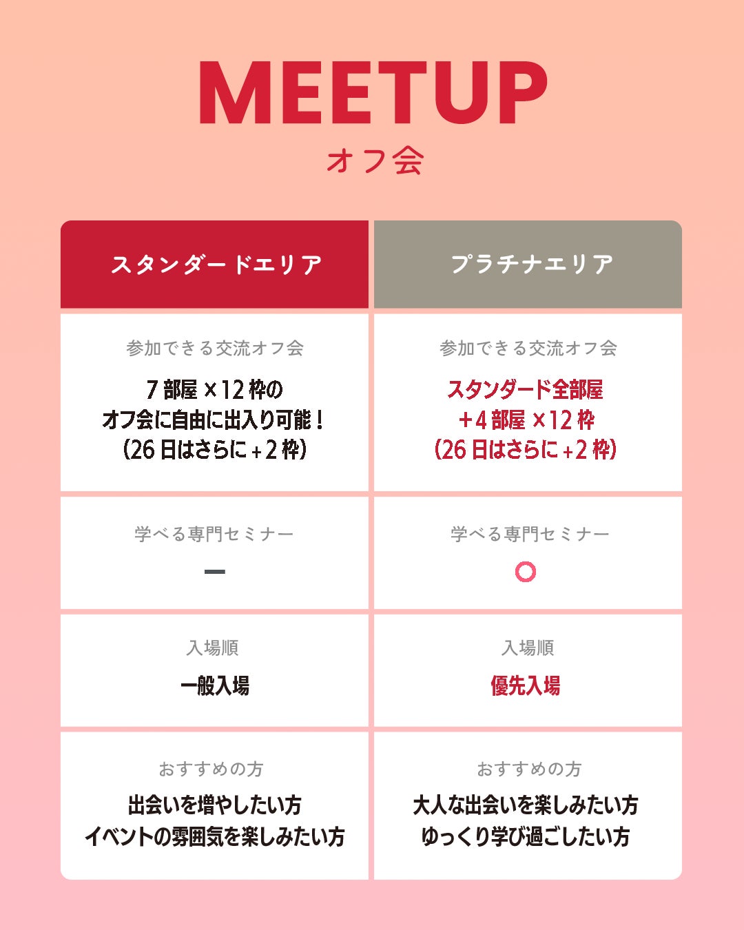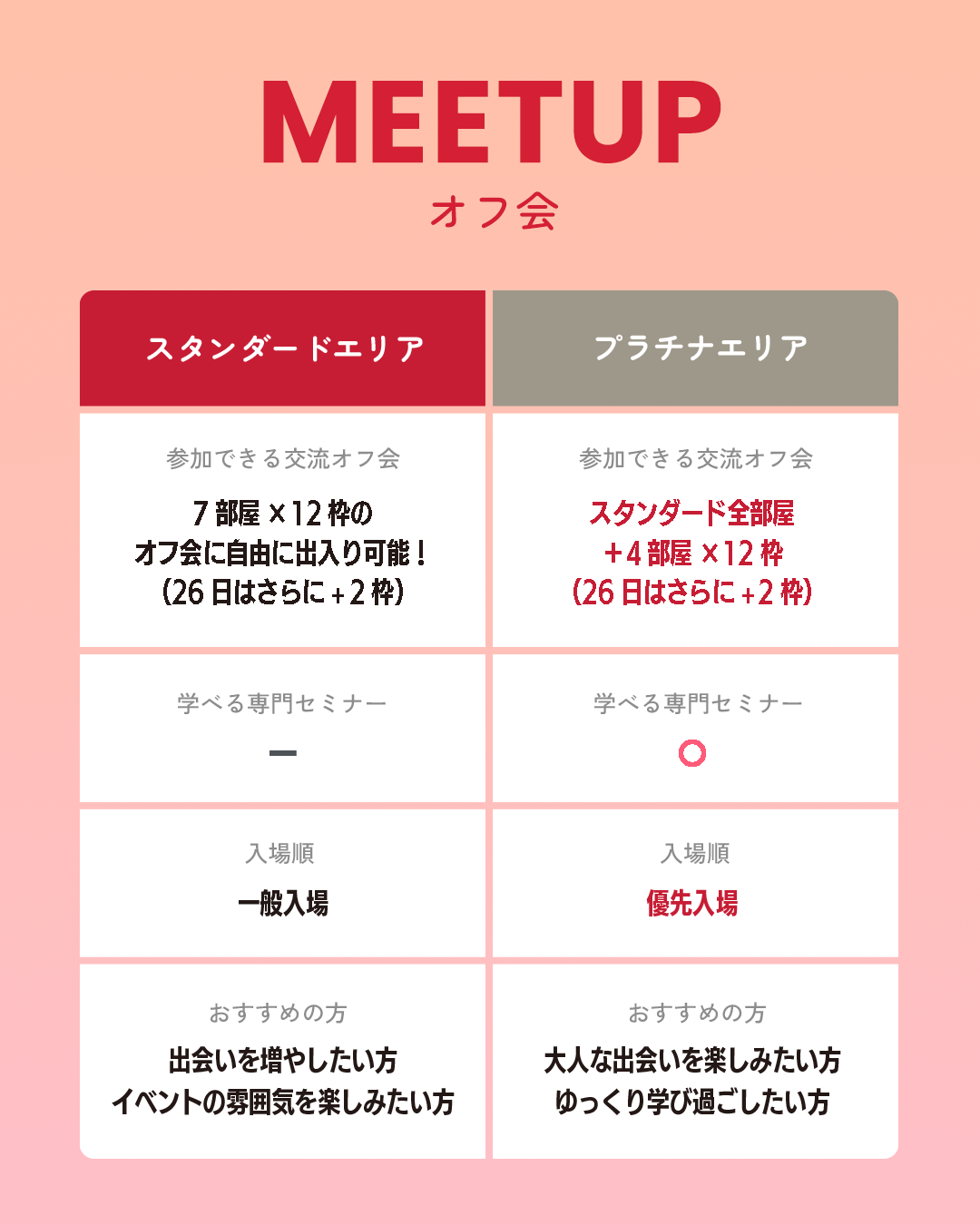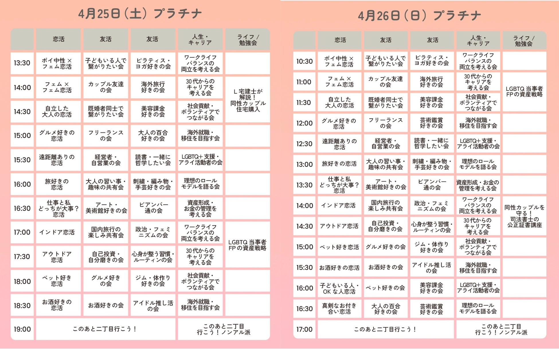 プラチナエリア:優先入場に加え、LGBTQ+専門家によるライフデザインセミナーや、ゆったりとした空間での深い交流を提供。