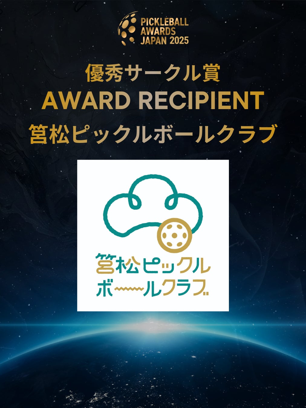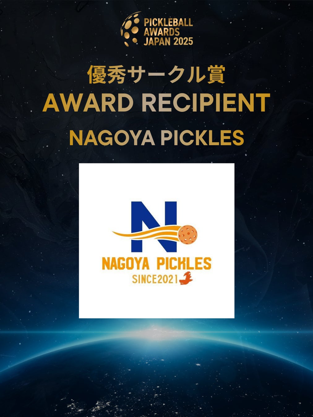 競技成績にとどまらず、日本のピックルボール界全体に対して象徴的・構造的な貢献を果たした存在に贈られる賞です。国内大会・国際舞台での継続的な競技実績に加え、チーム・コミュニティの中心としての存在感、そして日本市場におけるピックルボールの認知拡大に与えた影響力が高く評価されました。