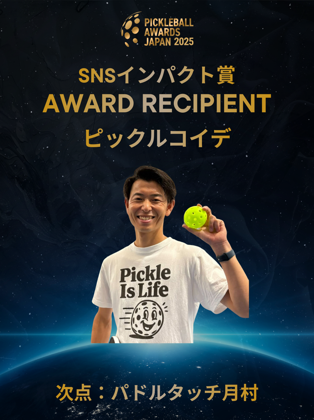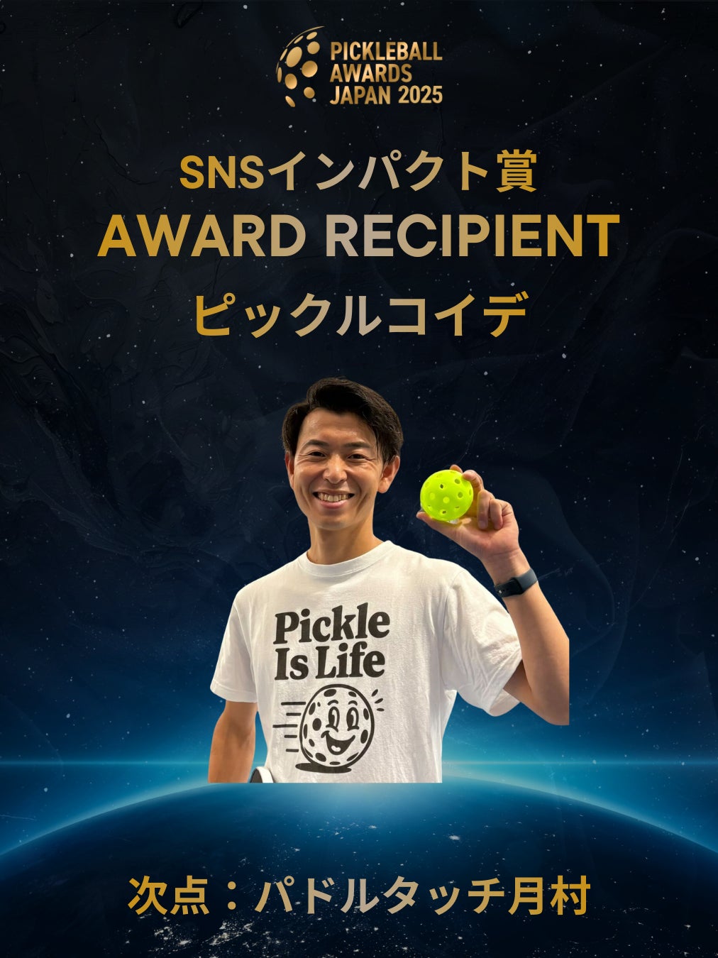 アメリカでピックルボールの成長を間近に見てきた立場から、日本でこのアワードが生まれる意義を強く感じております。今回は次点までしか発表できず心惜しいのですが、沢山の有志の方が得票しており、誰が選ばれても誇れるものになっていて、ピックルボールのこの発展を支えている方々の層が1段も2段も厚くなっていることを強く感じました。ほとんどの方は無償の献身でコミュニティを支えていただいている方々ばかりなのでそれを一部でも讃えるこのアワードはぜひ続けて頂ければと思います。