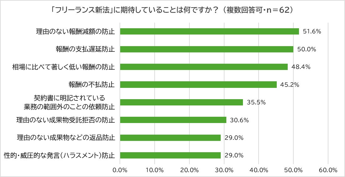 続いて、とても期待している・やや期待していると回答したフリーランスに「どんなことを期待しているのか?」聞きました。「理由のない報酬減額の防止」(51.6%)、「報酬の支払遅延防止」(50.0%)、「相場に比べて著しく低い報酬の防止」(48.4%)、「報酬の不払防止」(45.2%)が半数前後を占めました。報酬に関するトラブルは、フリーランスにとって死活問題になりかねないため、これらの期待値は高いのだと考えられます。