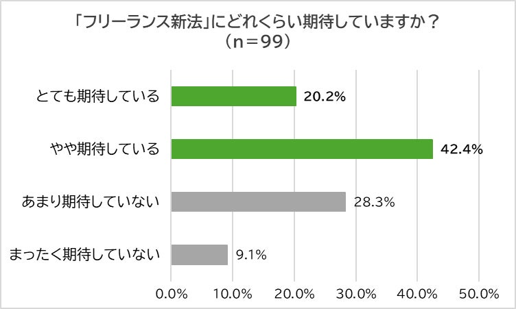 内容を理解している・なんとなく知っていると回答したフリーランスに「フリーランス新法への期待度」を聞くと、「やや期待している」(42.4%)が最も多く、「あまり期待していない」(28.3%)、「とても期待している」(20.2%)、「まったく期待していない」(9.1%)となりました。