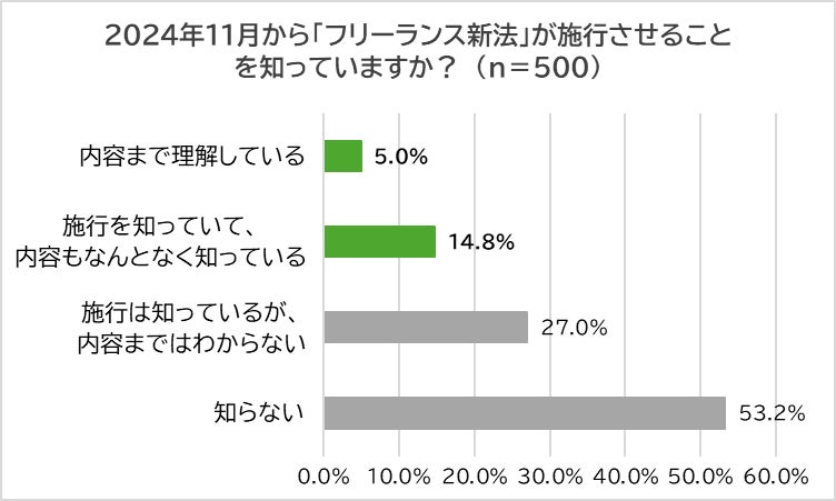 次に、「2024年11月から『フリーランス新法』が施行されることを知っているか?」聞いたところ、「知らない」が半数以上(53.2%)いました。また、「内容まで理解している」は1割に満たず(5.0%)、「施行を知っていて、内容もなんとなく知っている」も1割超(14.8%)と理解度の低さが浮き彫りになりました。