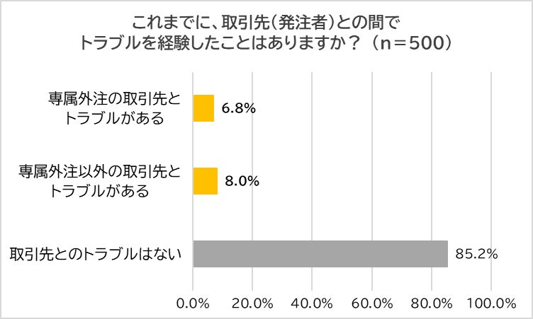 「これまでに取引先(発注者)との間でトラブルを経験したことがあるか?」聞いたところ、「専属外注の取引先とトラブルがある」(6.8%)、「専属外注以外の取引先とトラブルがある」(8.0%)となり、15.8%のフリーランスが何らかのトラブルを経験したことがあることがわかりました。
