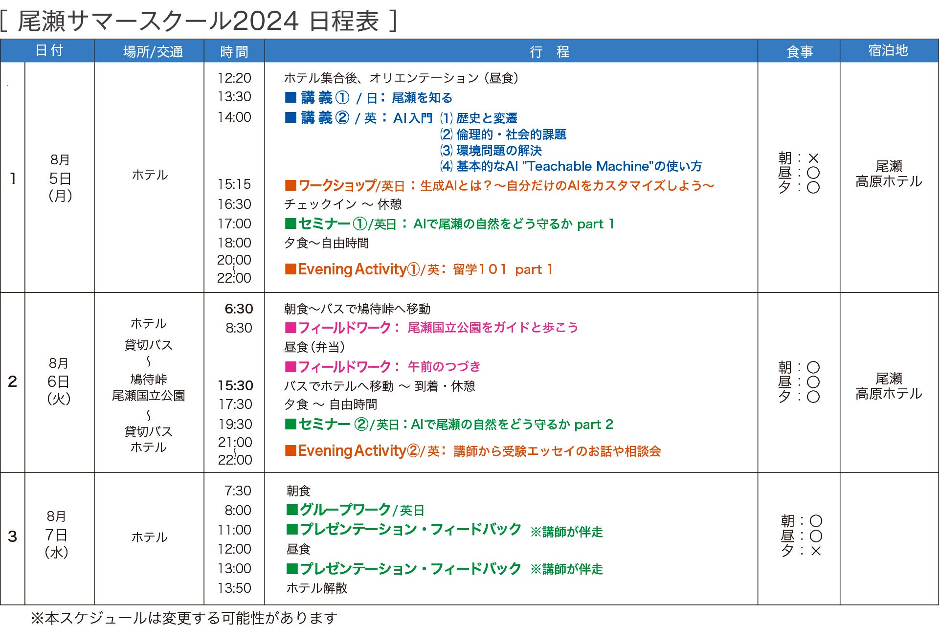 名称:尾瀬 Summer School 2024~ワクワクを原動力に!大自然の中で最先端技術AIを英語で学ぶ3日間~