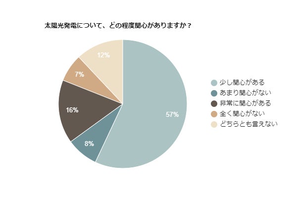 太陽光発電について「少し関心がある」と答えた方が57%に上りました。また、「非常に関心がある」と答えた方も16%に達し、約7割の方が太陽光発電に対して関心を持っていることがわかりました。