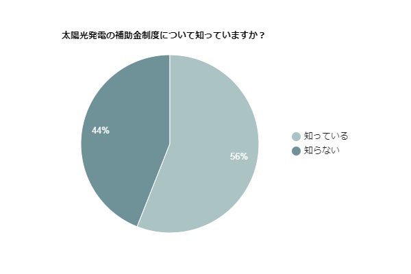 太陽光発電に関連する補助金制度を「知っている」と答えた方は56%に上りました。自治体によって補助金制度が異なるため、お住まいの地域で補助金制度が存在するか確認することをおすすめします。