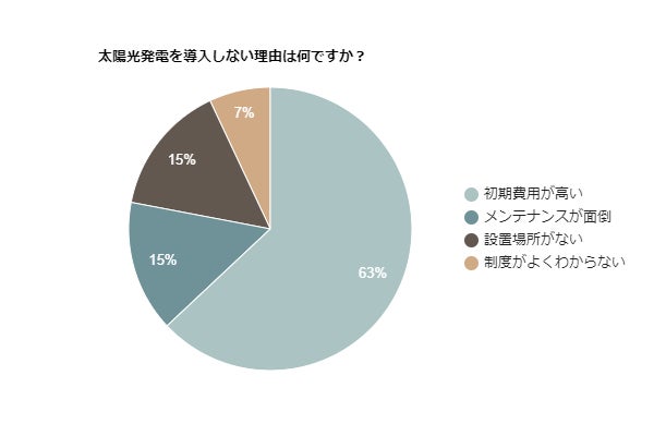 太陽光発電を導入しない理由として「初期費用が高い」と回答した方は63%に達しました。電気代削減の効果が期待できる一方で、初期の設置費用が負担となり、導入をためらう要因となっているようです。
