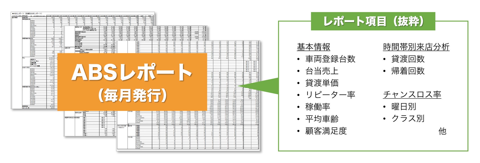 ABSレポートは、加盟店が自店の課題を明確にし、具体的な改善策を講じるための無料提供サービスです。ニコニコレンタカーではABSレポートをはじめとした、様々な加盟店向けサービスを展開しており、加盟店様の業績アップへの取り組みを推進しております。