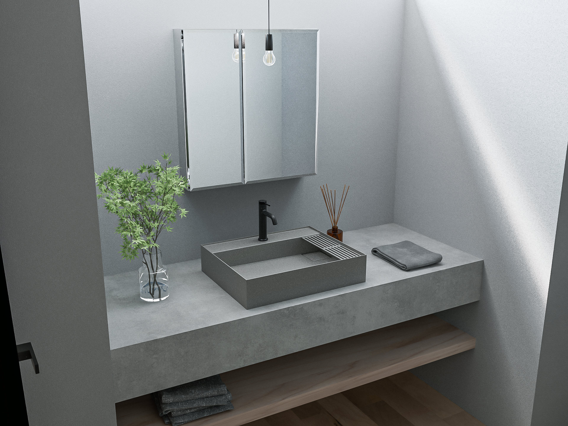 置き型の洗面ボウルだが、ステンレスを用いることによって造作や他の素材では難しいフォルムにまとめている。排水口を隠す手法や、排水用の水勾配の取り方、スノコ状のラックなども気を遣いプロダクトとしての質を高めていると感じた。またそれら全てを単一の塗装仕上げで統一したことも成功している。オリジナルの水洗金物も期待したい。