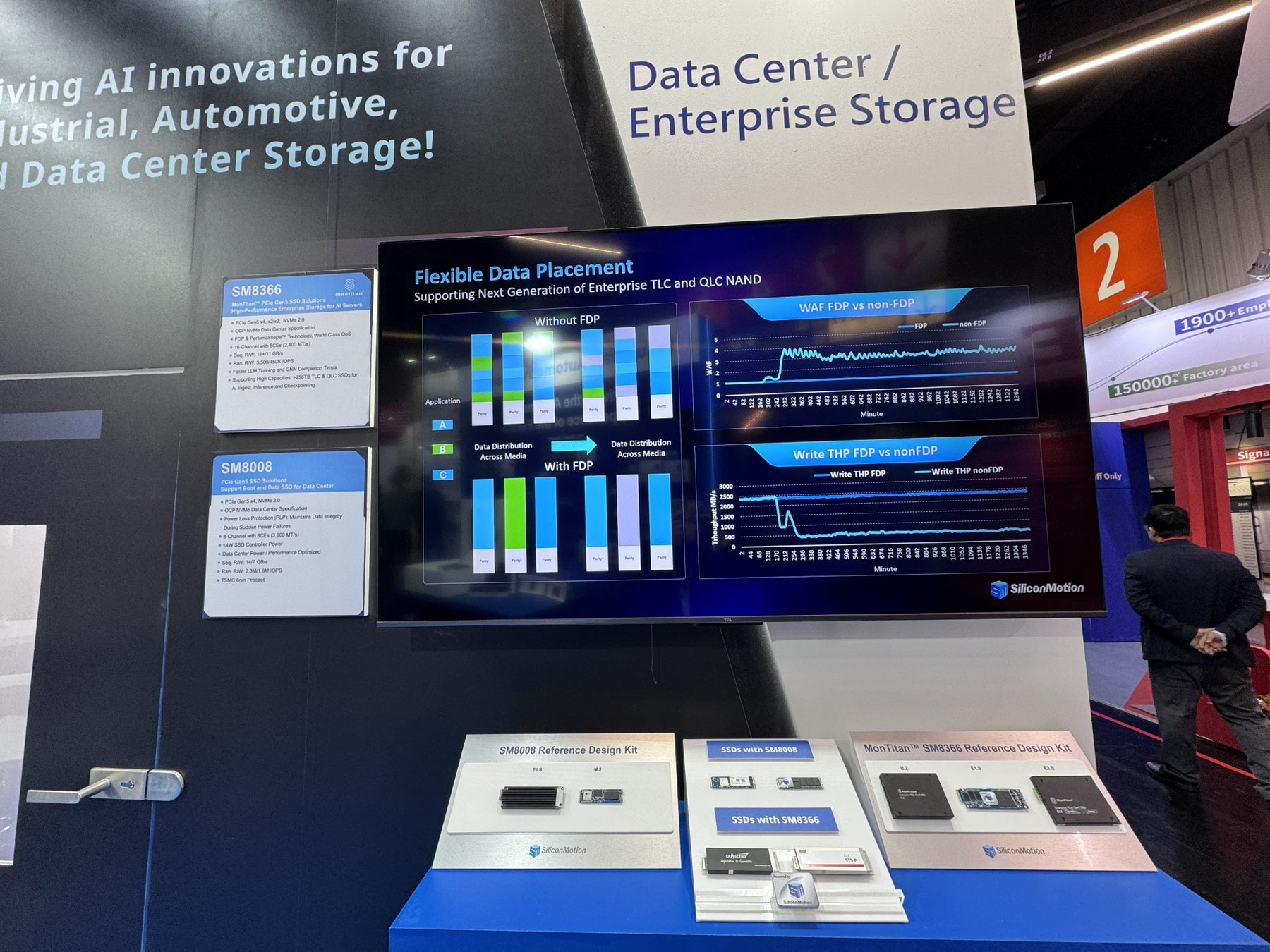 シリコン・モーションは、ブートストレージのポートフォリオに加え、SM8366を含むMonTitan®エンタープライズSSDコントローラソリューションも展示します。これらのソリューションは、GPU近傍、コンピュート、ニアライン、およびエッジサーバー用途向けに最適化されています。このSM8366 PCIe Gen5エンタープライズSSDコントローラは、高性能AIインフラストラクチャをサポートするよう設計されており、GPUアクセラレーテッド・コンピューティング環境において、効率的なデータ移動とスケーラブルなストレージアーキテクチャを実現します。